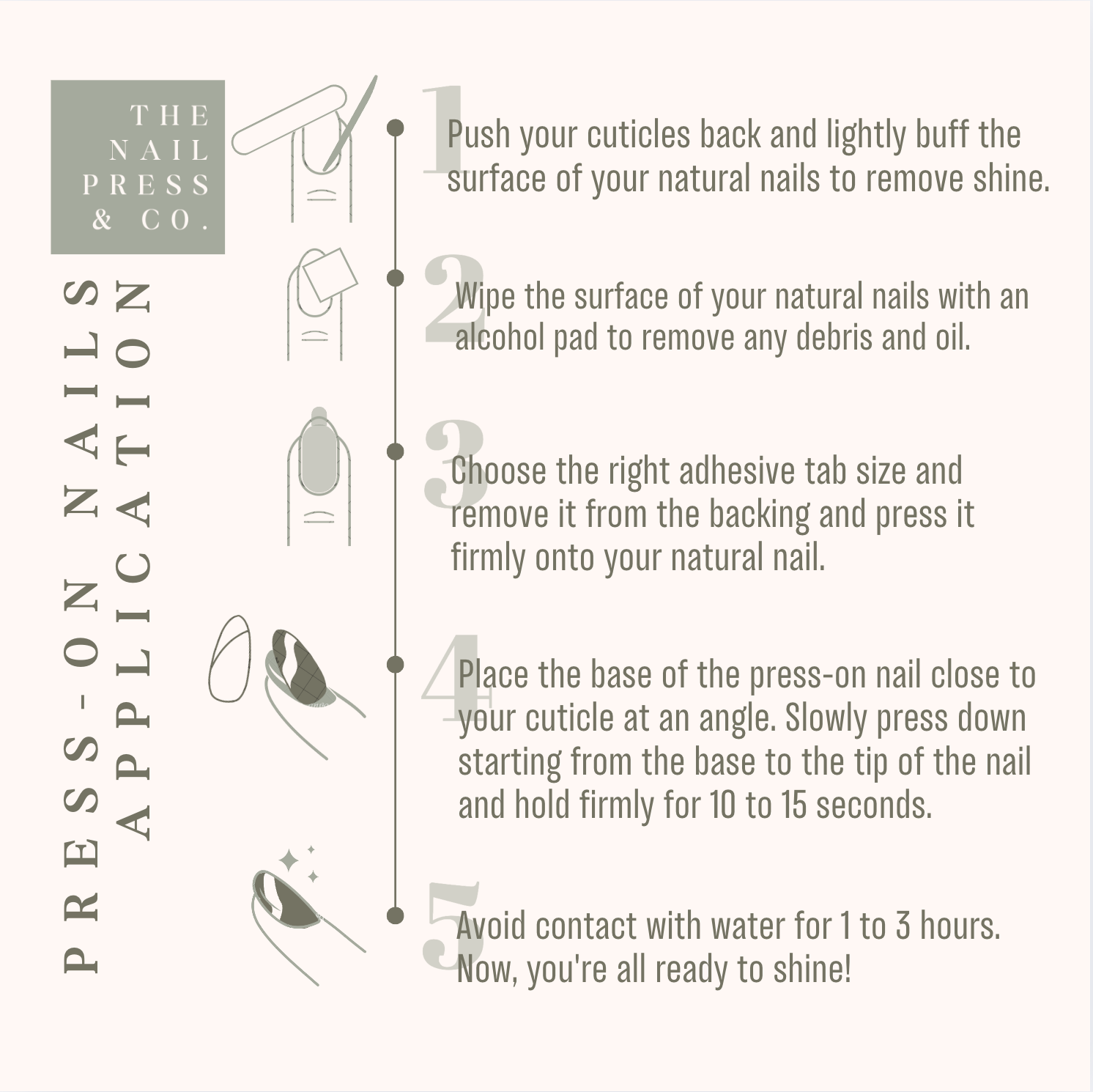 Our press-on nails are designed to be quick, stylish, and reusable. Follow our visual guide to size and apply your set for a perfect fit and salon-quality finish in minutes.