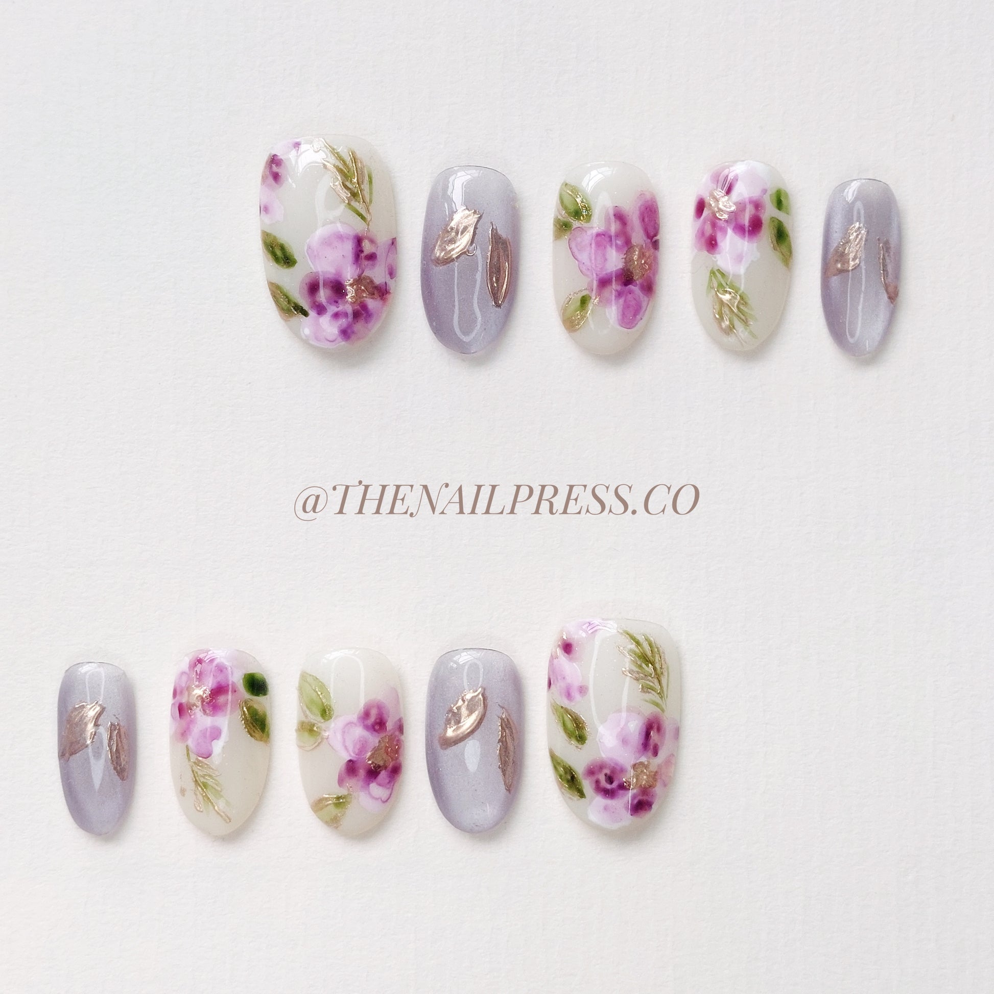 Indulge in elegant charm with watercolour purple flowers and soft lavender cat-eye accent nails. Delicate gold details add a luxurious touch, while the medium oval rounded shape enhances the refined, graceful look. These handmade press-on nails provide a salon-quality finish with effortless application.