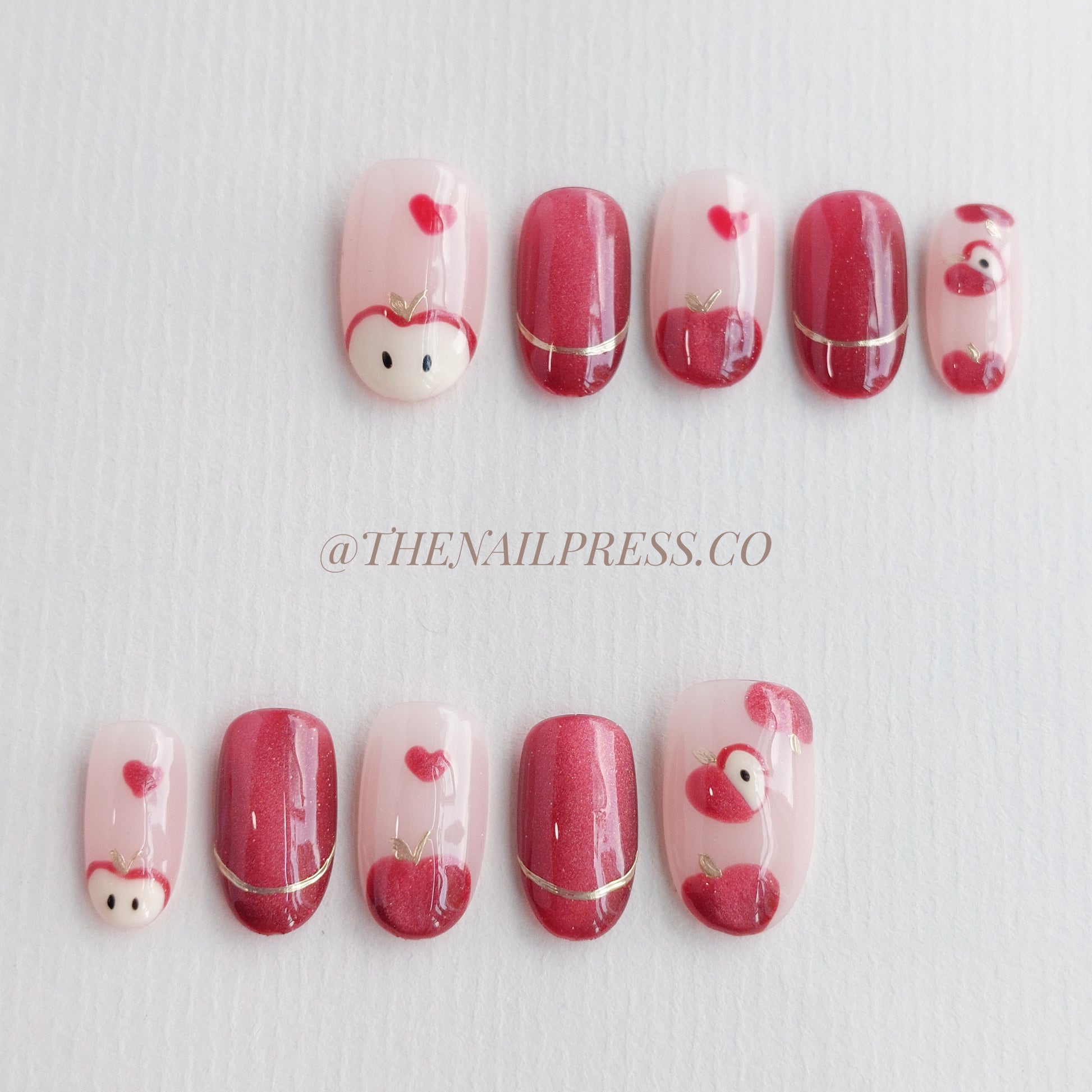 Keep your style fresh with An Apple a Day, featuring a vibrant red cat-eye finish and a hand-painted apple accent for a playful, eye-catching effect. The medium rounded shape enhances the bold, multidimensional glow, perfect for adding a pop of colour to any look. Handcrafted and reusable, these nails provide a salon-quality finish that keeps your nails effortlessly chic and polished.