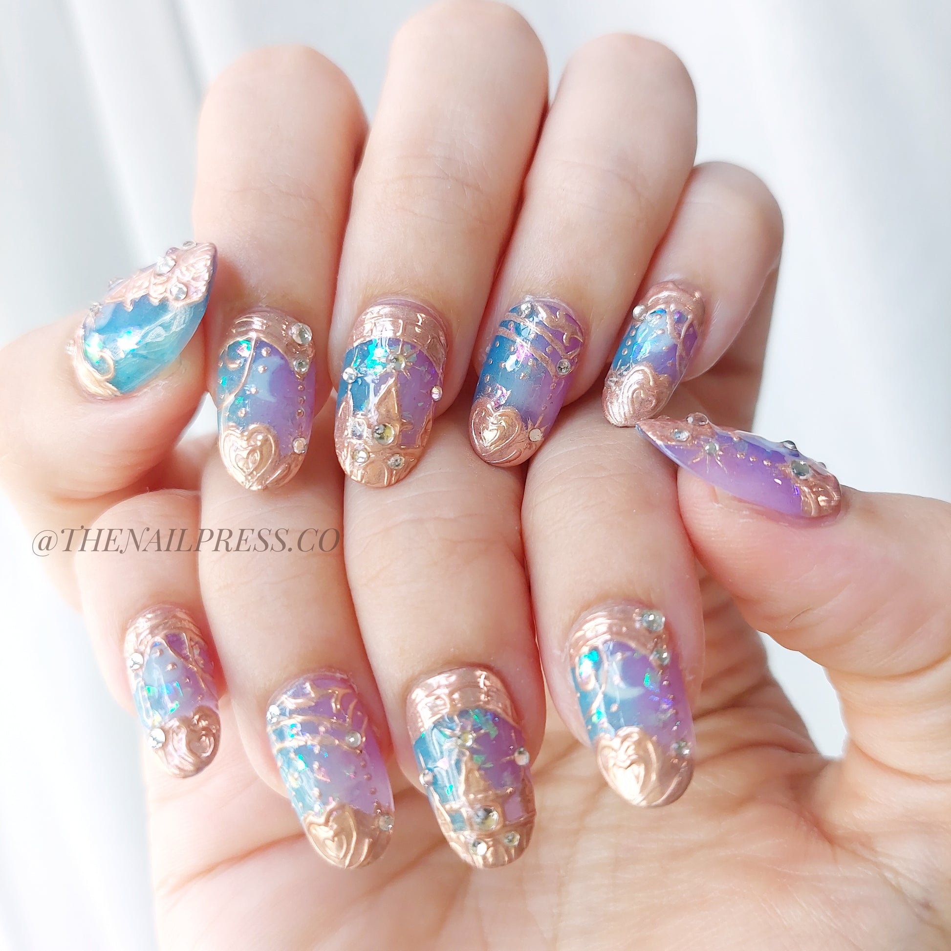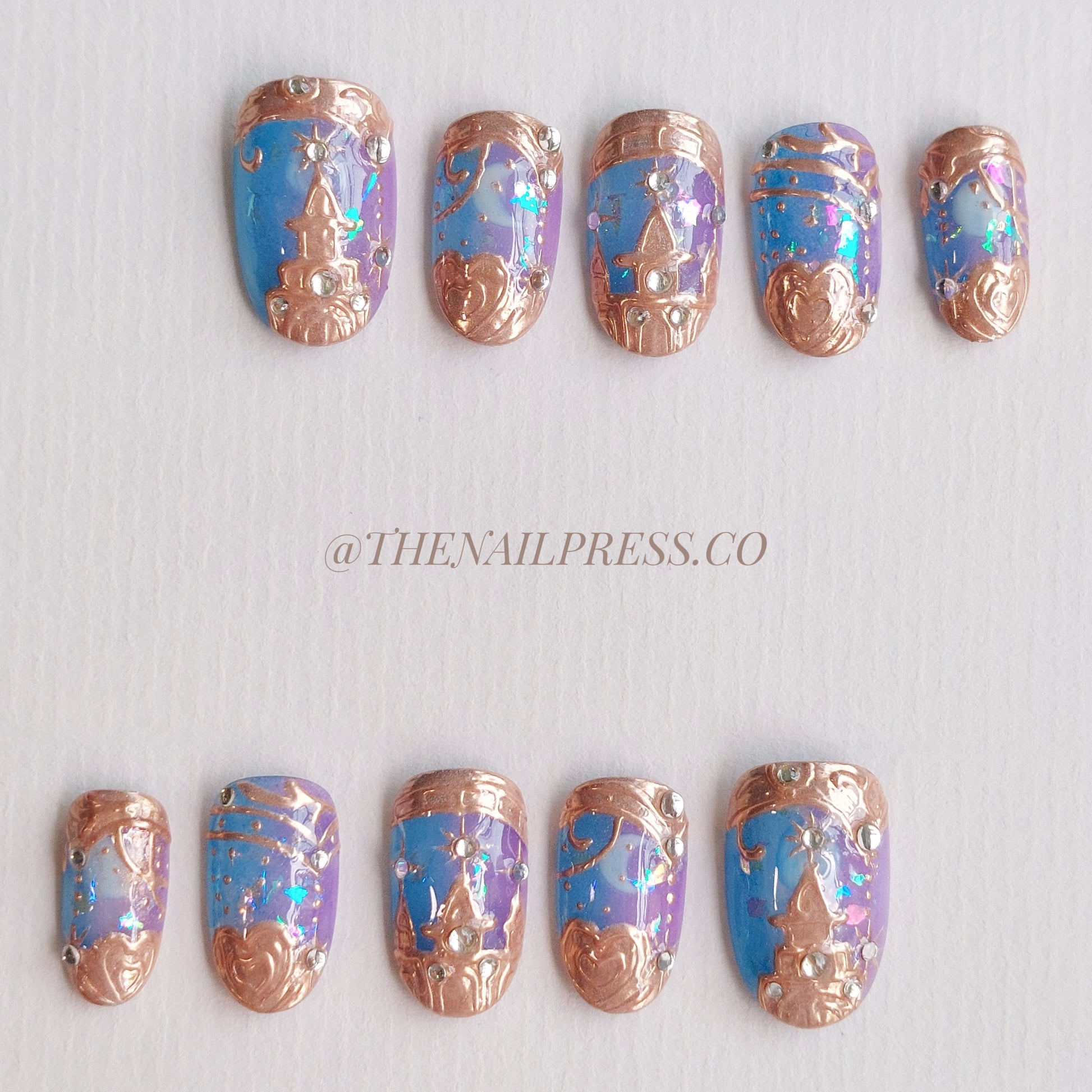 Step into a fairytale with Aurora's Enchanted Castle, featuring a dreamy ombre of pink, purple, and blue inspired by twilight skies. Rose gold accents shimmer like castle spires, adding elegance and whimsy. The medium rounded shape enhances its enchanting charm. These handmade press-on nails are crafted for effortless wear, providing a polished, salon-quality finish every time.