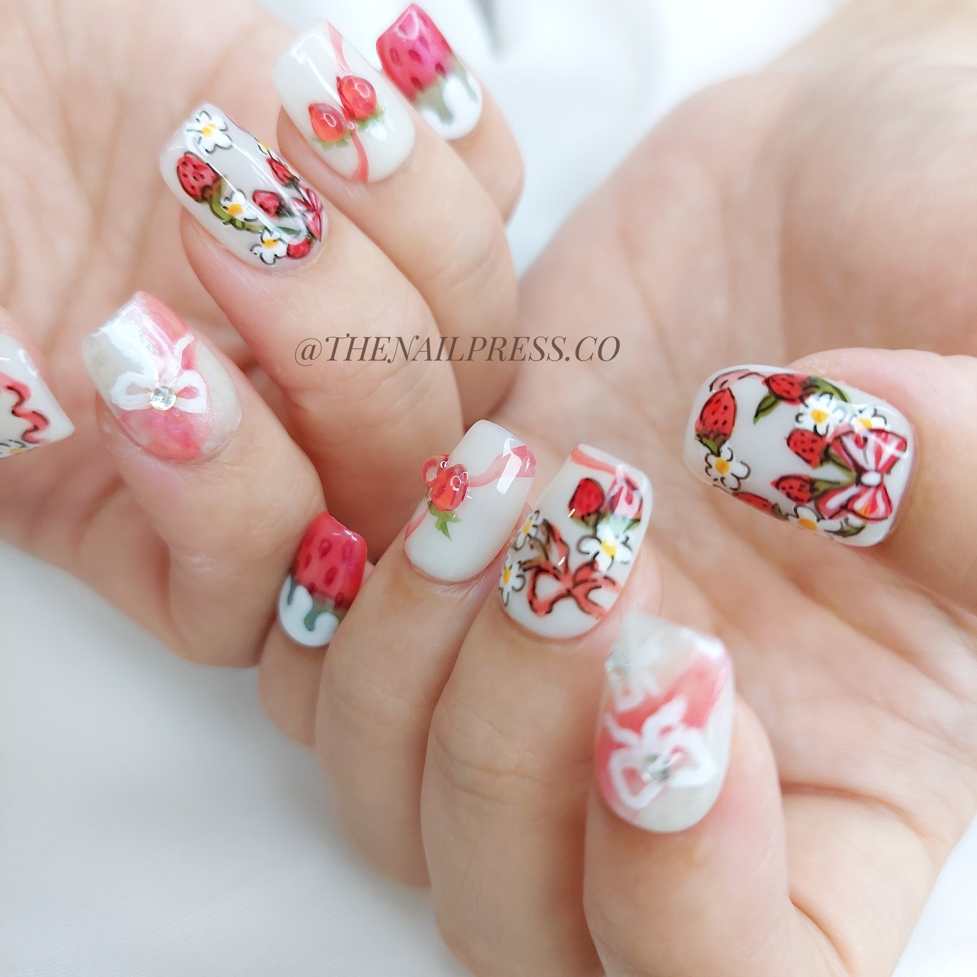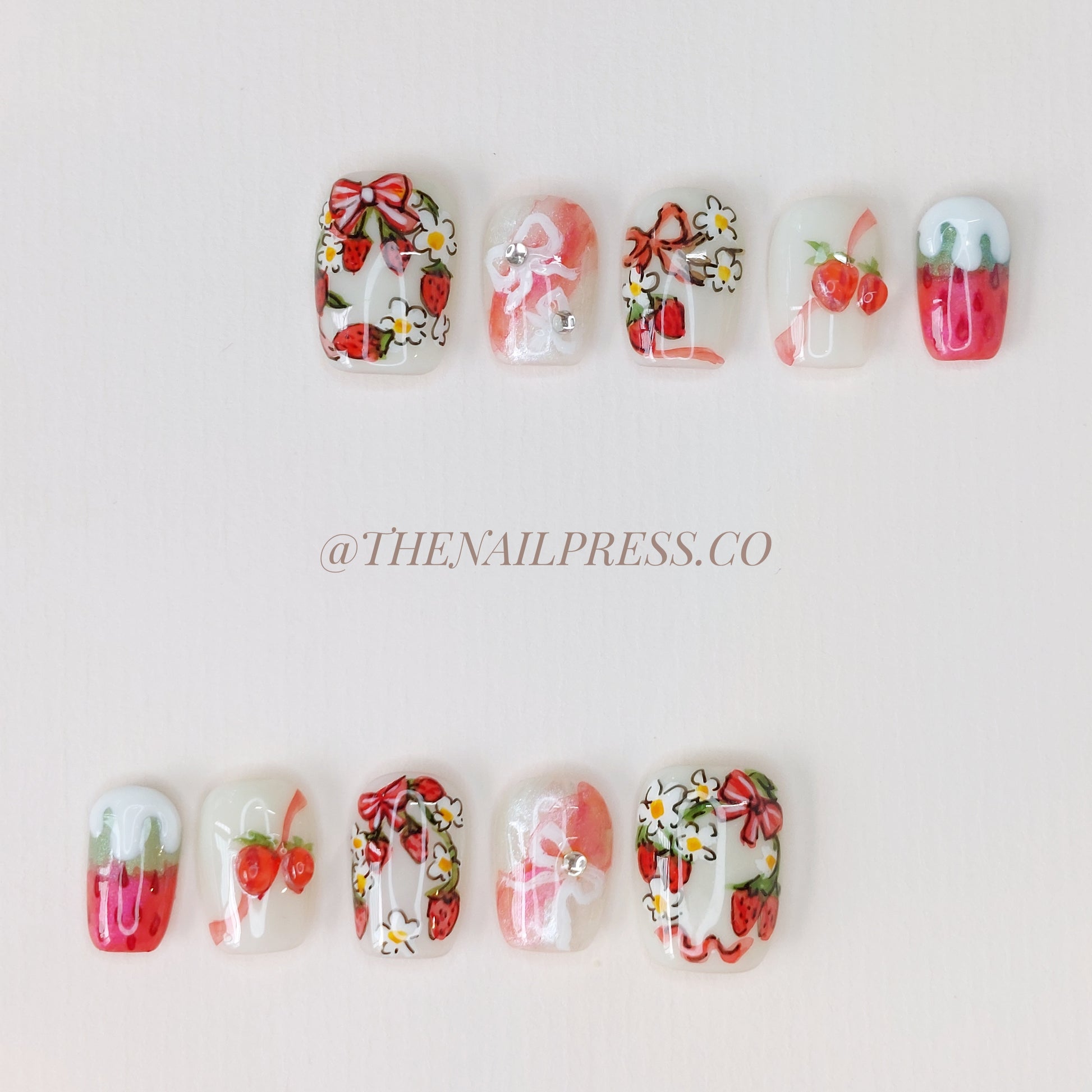 Hand-drawn strawberries and sweet little bows add a playful touch to your style in Berry Bow. The short ballerina shape brings a modern, flattering silhouette while highlighting its fun, youthful vibe. These handmade press-on nails are reusable and offer a salon-quality finish for effortless beauty.