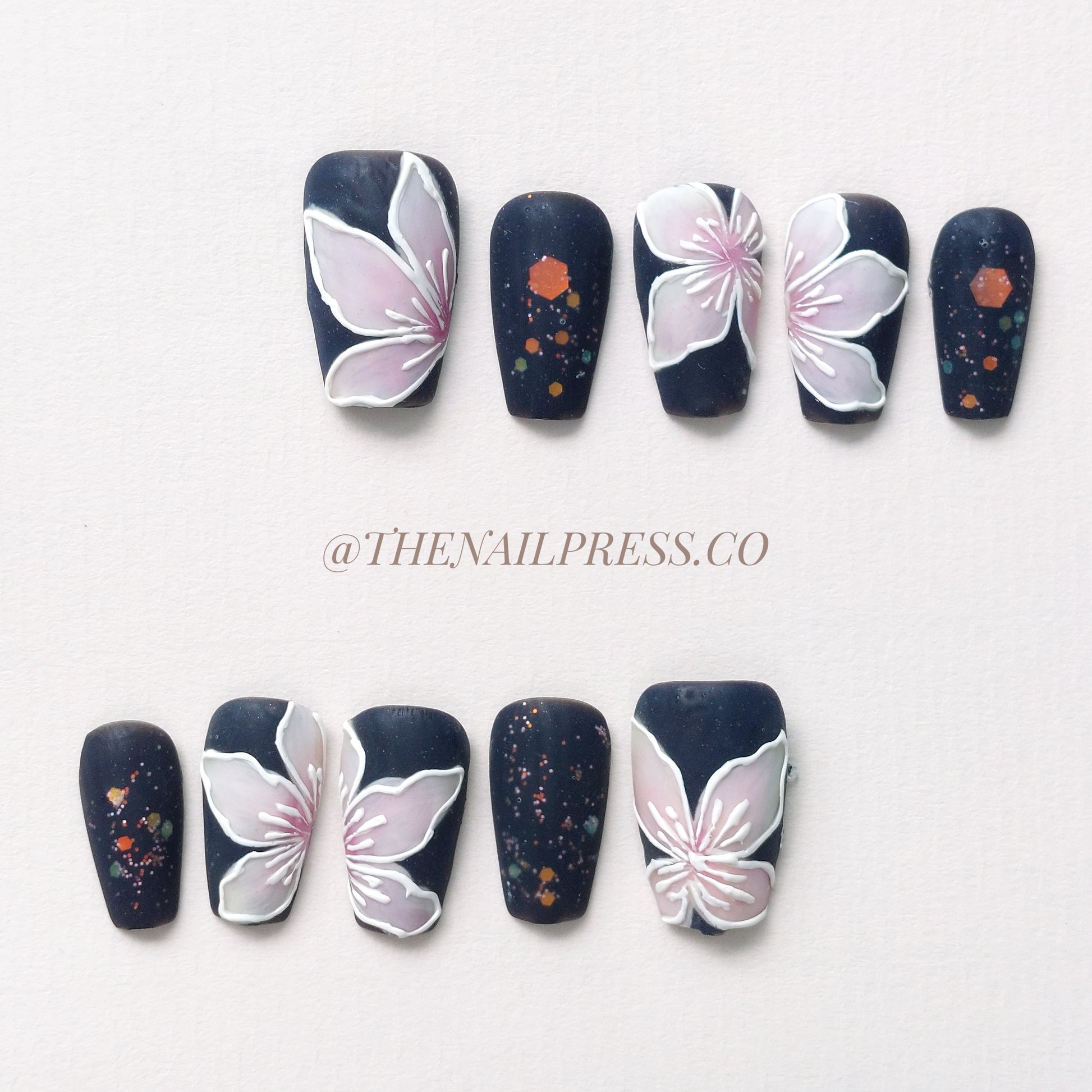 Embrace the allure of elegance with Black Velvet Bloom. A deep matte black base is paired with delicate hand-painted purple flowers, while subtle matte sparkles add a soft, enchanting glow. The short coffin shape offers a chic, edgy silhouette, perfect for those who love bold yet refined style. These handmade press-on nails offer a salon-quality finish with effortless application.