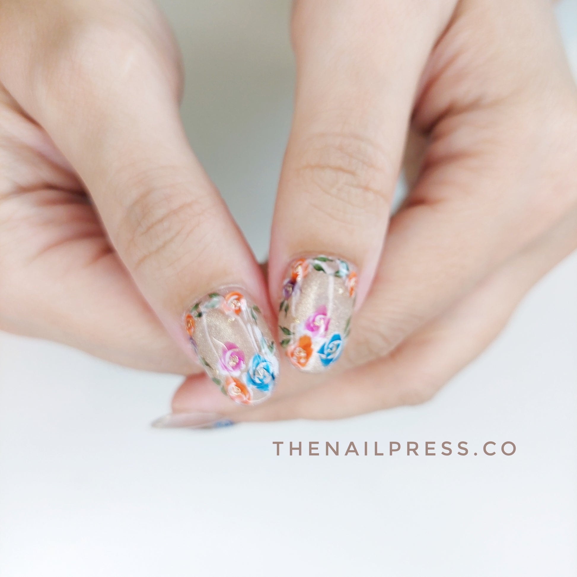 Shimmery champagne gold cat-eye nails adorned with colourful roses in blue, pink, and orange create a vibrant, eye-catching look in Bloomed Spectrum. The medium oval rounded shape enhances its playful, sophisticated charm. Handmade, reusable, and salon-quality for effortless, luminous elegance.