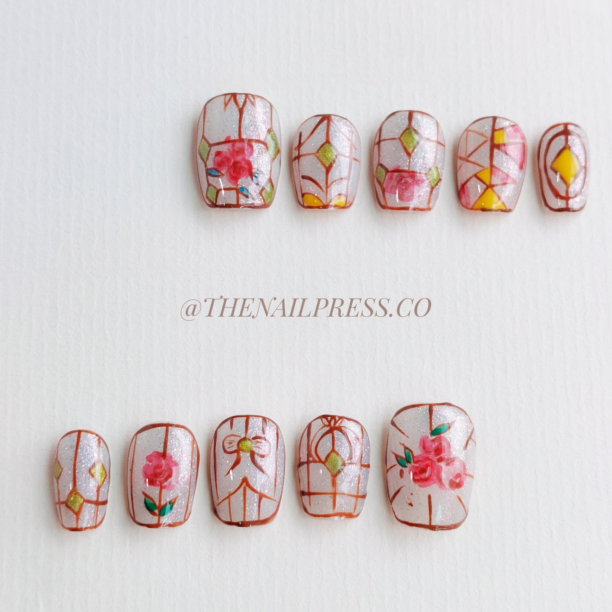 Step into vibrant beauty with Blooming Through Glass, featuring stained glass-inspired floral patterns brought to life with bright, rich colours set against a shimmering base for a magical effect. The short ballerina shape adds elegance, enhancing the interplay of light and colour that gives the roses an almost ethereal quality. Handcrafted and reusable, these nails provide a salon-quality finish that keeps your nails effortlessly enchanting and polished.