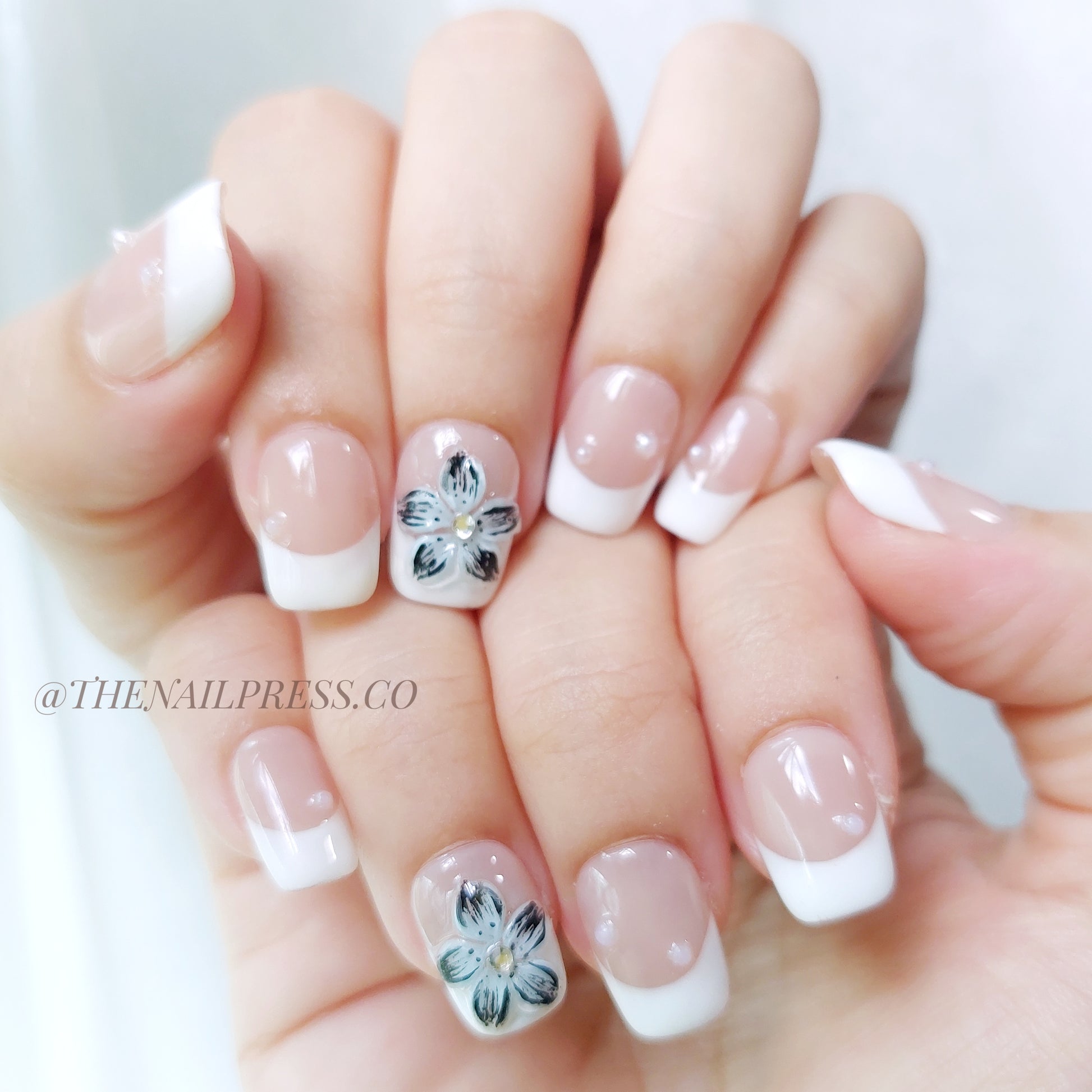 With hand-sculpted blue and black flowers, Blue Moon Blossom blends elegance and intrigue. Small pearls add refinement to the French tips, perfect for those who appreciate timeless beauty and modern artistry. The short square shape enhances its sleek finish. These handmade press-on nails are designed for effortless wear, delivering a salon-quality finish that looks beautifully professional.