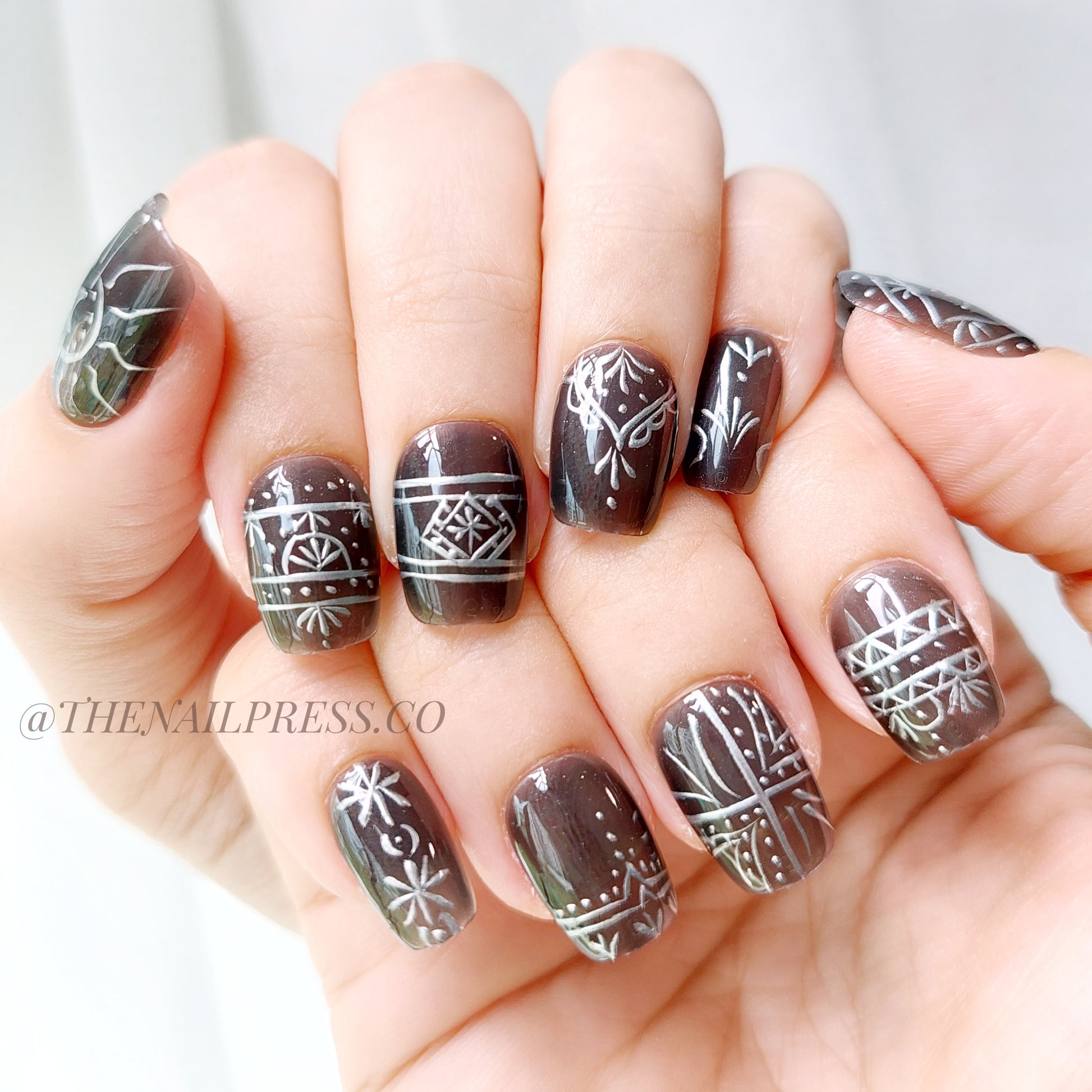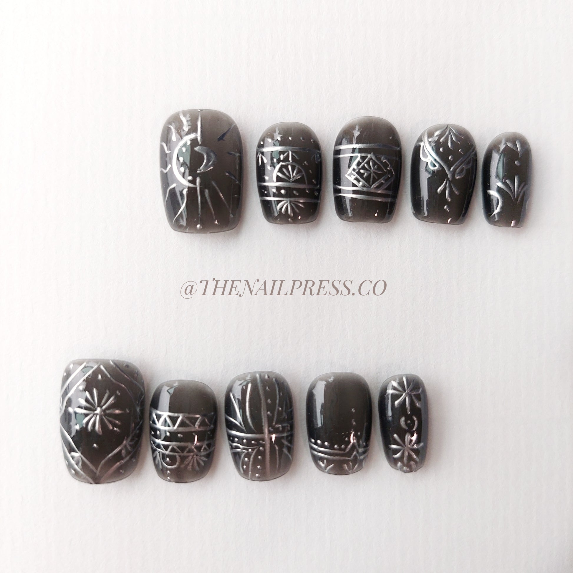 Celestial-inspired patterns meet bohemian charm in Boho Astral. Translucent black nails with silver accents capture the beauty of astral bodies, blending cosmic elements with free-spirited artistry. Short ballerina shape provides a sleek, versatile look. Handmade, reusable, and salon-quality for nails that are effortlessly chic and celestial-inspired.