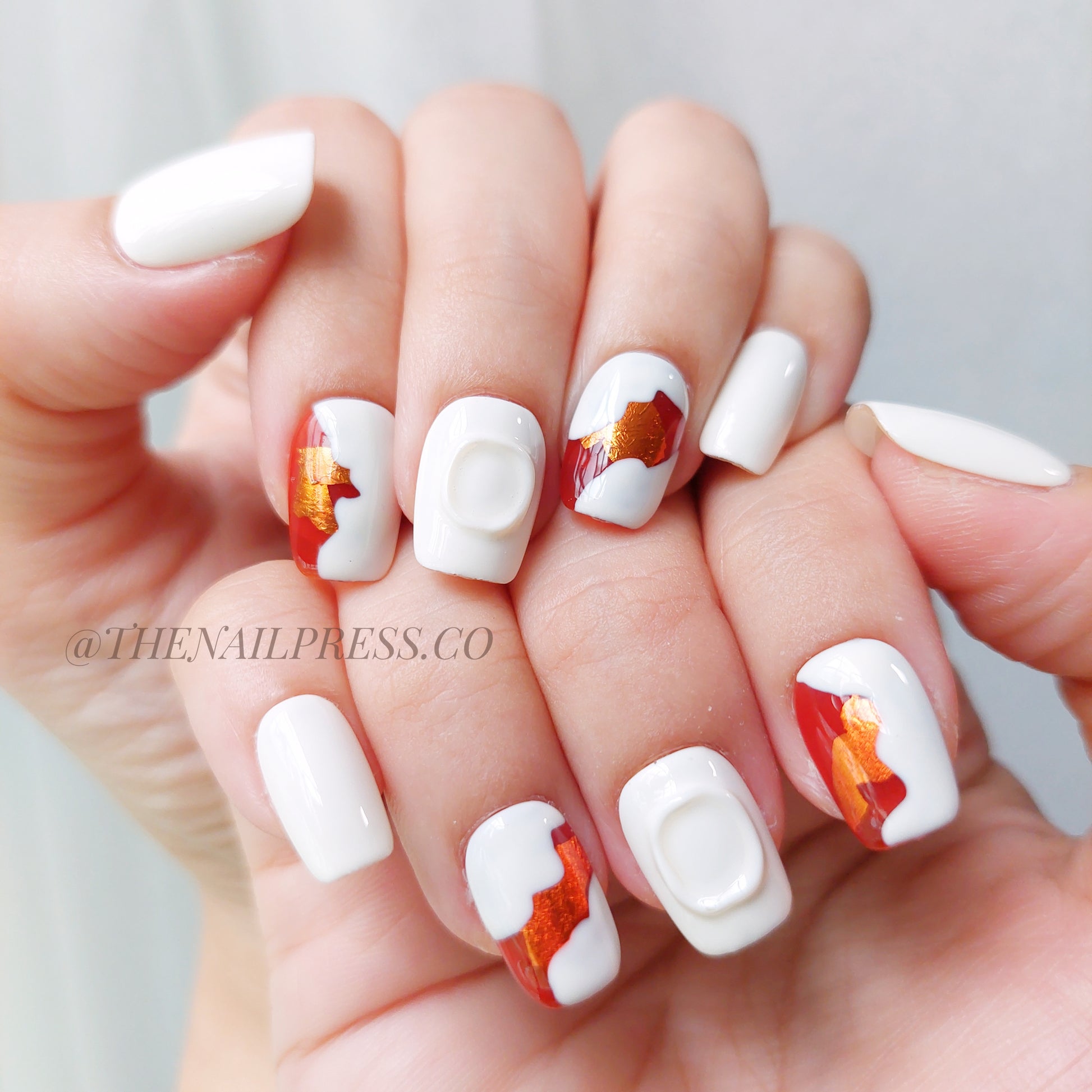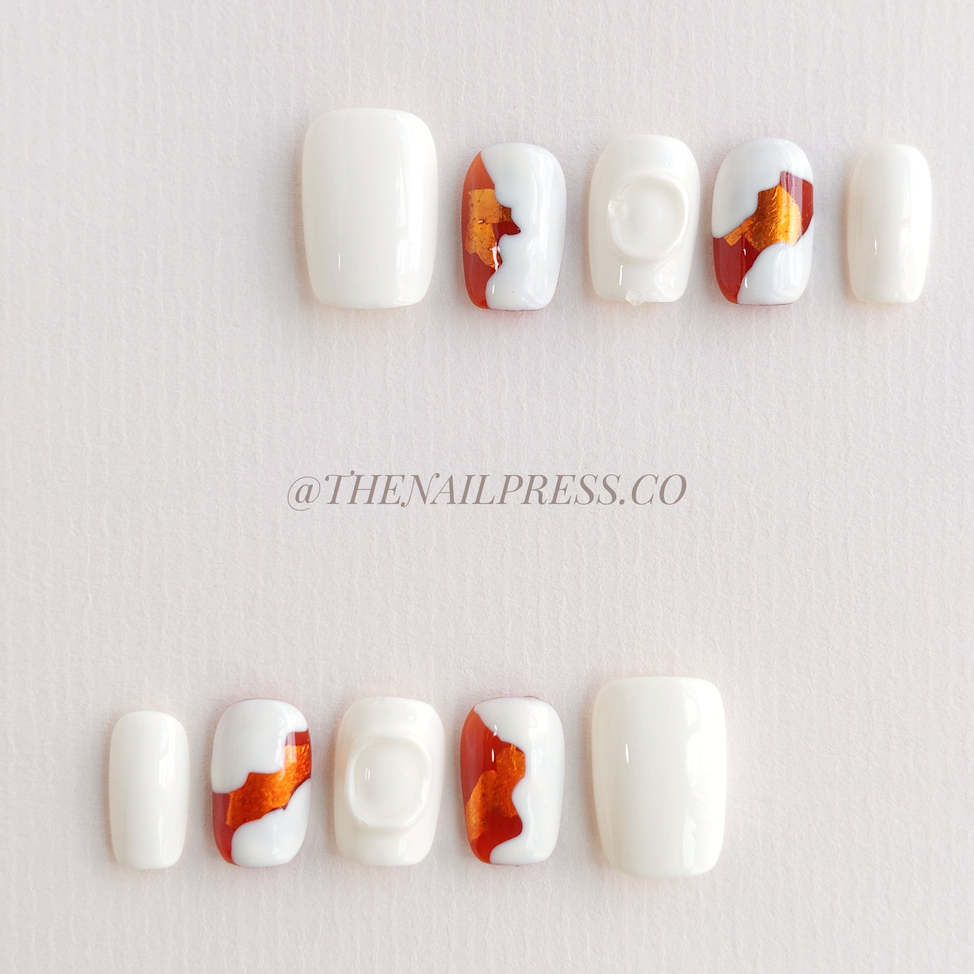 Make a striking statement with Bold Simplicity. White nails are highlighted with vibrant orange and gold abstract patterns, creating a contemporary and sophisticated look, with a sculpted ring detail for subtle refinement. Short square shape provides a sleek, polished silhouette. Handmade, reusable, and salon-quality for a flawless, standout look.