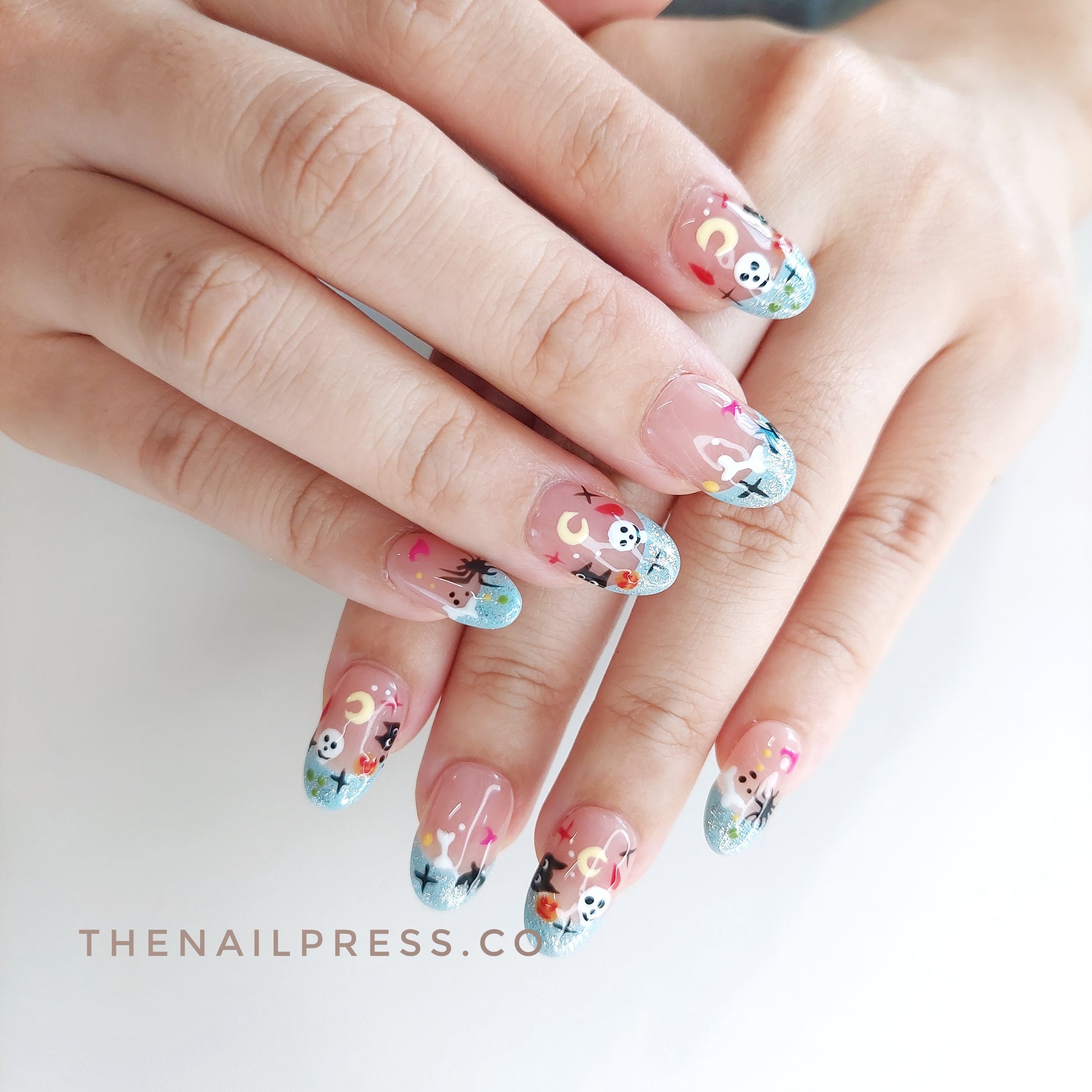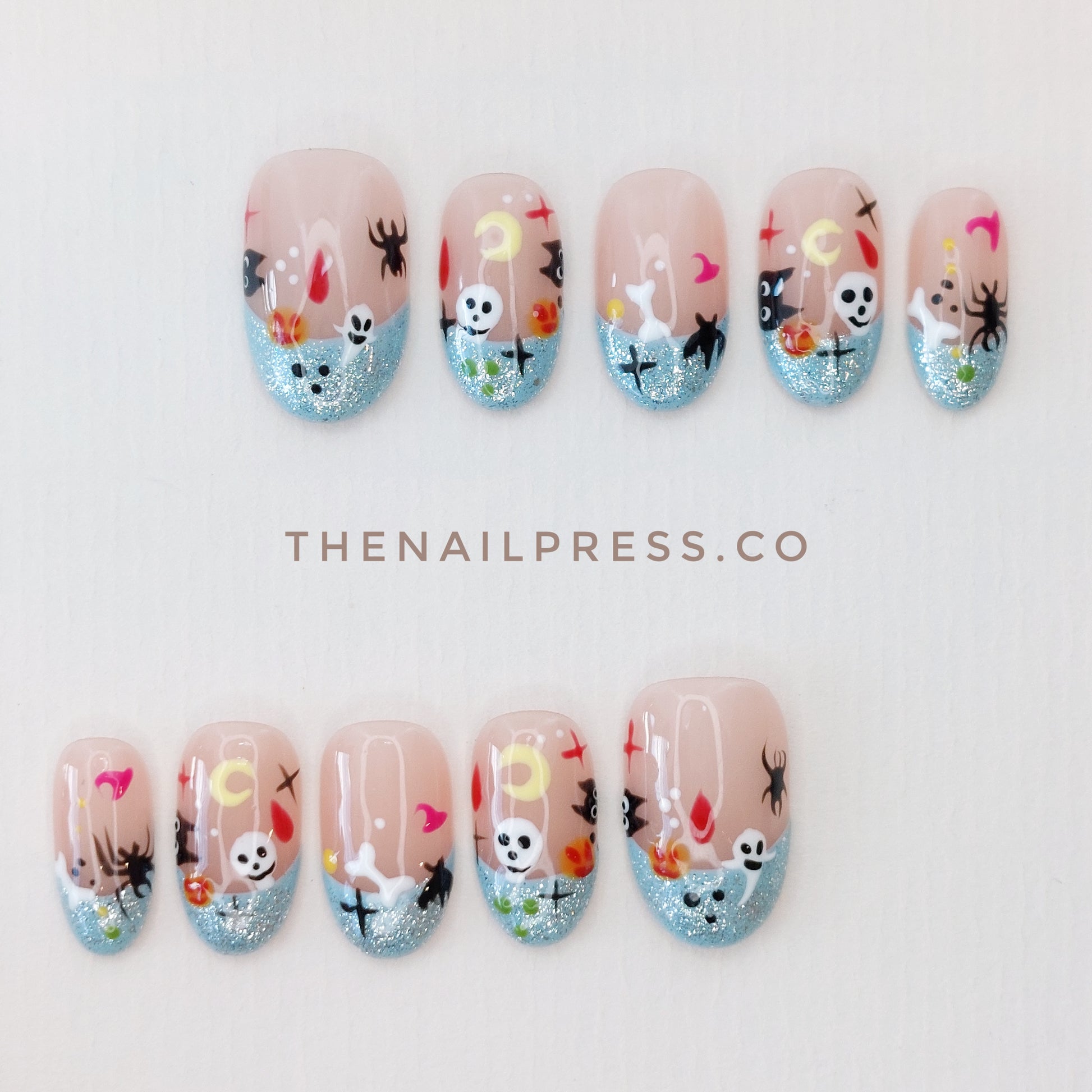 Sparkling light blue French tips are adorned with tiny Halloween motifs, adding a touch of playful magic to the design. The medium oval rounded shape enhances its sweet, whimsical charm, perfect for the spooky season and beyond. These handmade press-on nails provide a salon-quality finish with effortless application.