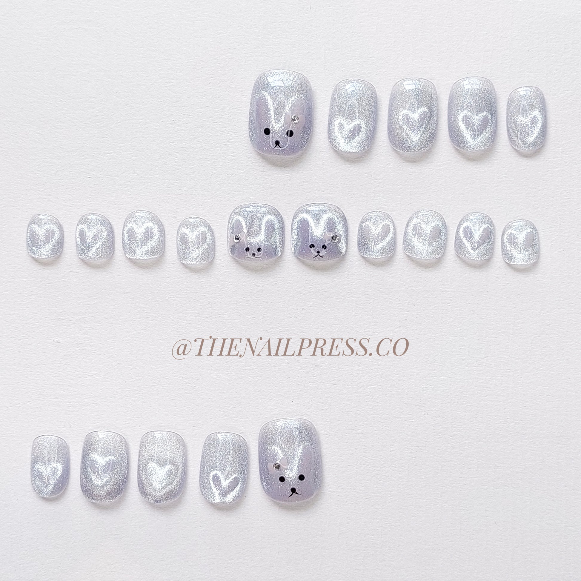 Add a touch of playful magic with Bunny’s Secret Glow, a sparkly cat-eye design that shimmers beautifully while hiding the sweetest surprises. Look closely to find a hidden bunny and tiny hearts nestled within the glow. The short squoval shape offers a comfortable, natural look for everyday wear. This design comes with matching kids' nails, making it perfect for sweet twinning moments. These handmade press-on nails are crafted for effortless wear, delivering a polished, salon-quality finish.