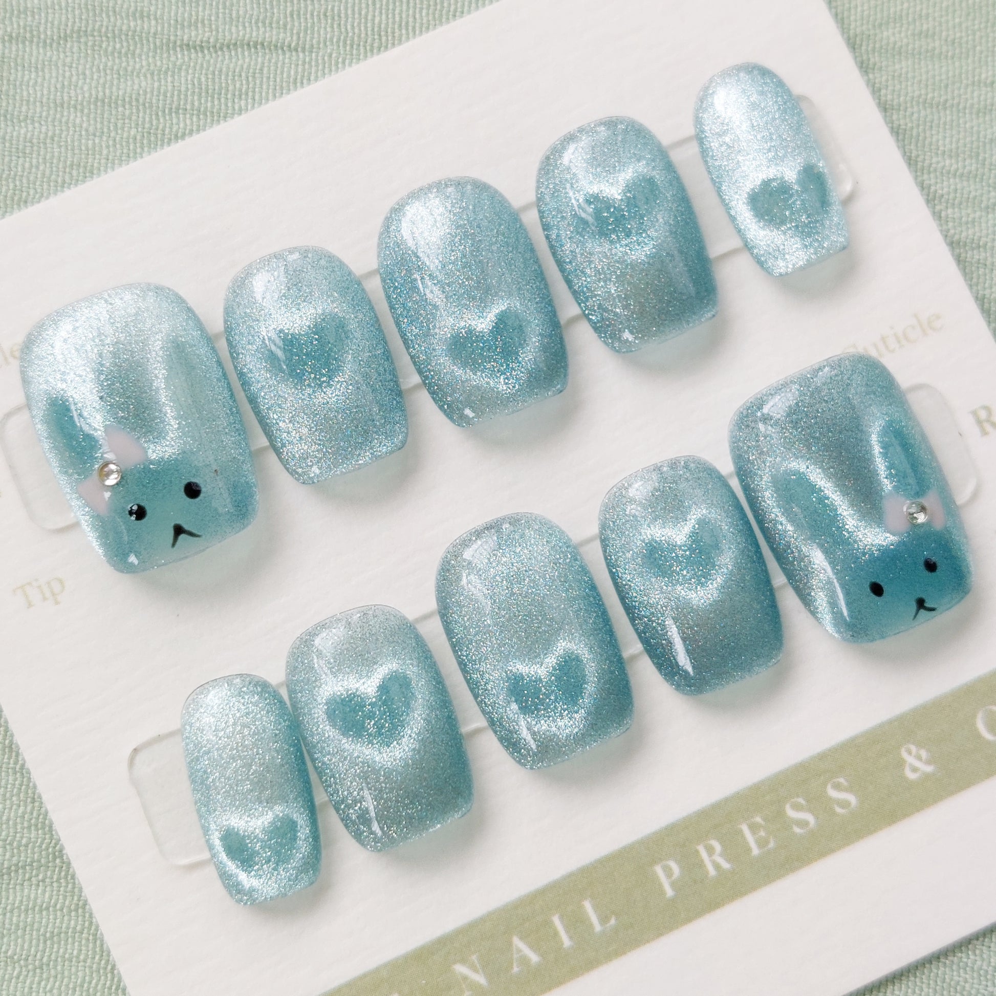 Add a touch of playful magic with Bunny's Turquoise Glow, a sparkly cat-eye design that shimmers beautifully while hiding the sweetest surprises. Look closely to find a hidden bunny and tiny hearts nestled within the glow. The short square shape offers a comfortable, natural look for everyday wear. These handmade press-on nails are crafted for effortless wear, delivering a polished, salon-quality finish.