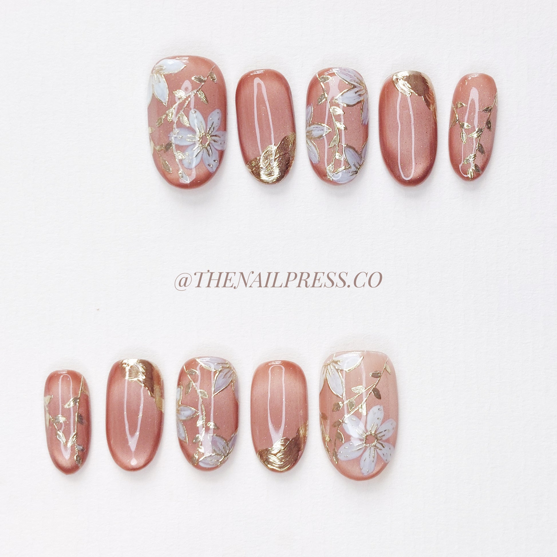 Illuminate your nails with Burnt Amber Bloom, where deep amber cat-eye meets soft floral accents. Golden tones and intricate florals add a touch of luxury and grace to your fingertips. The medium rounded shape enhances the elegance. Handcrafted and reusable, these nails offer a salon-quality finish for effortlessly polished style.