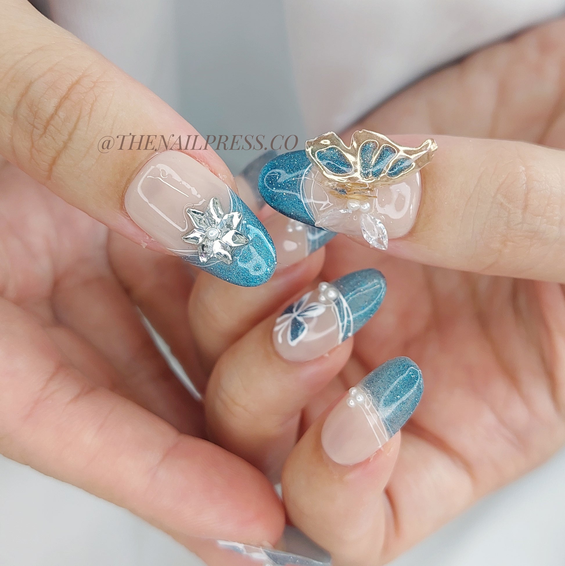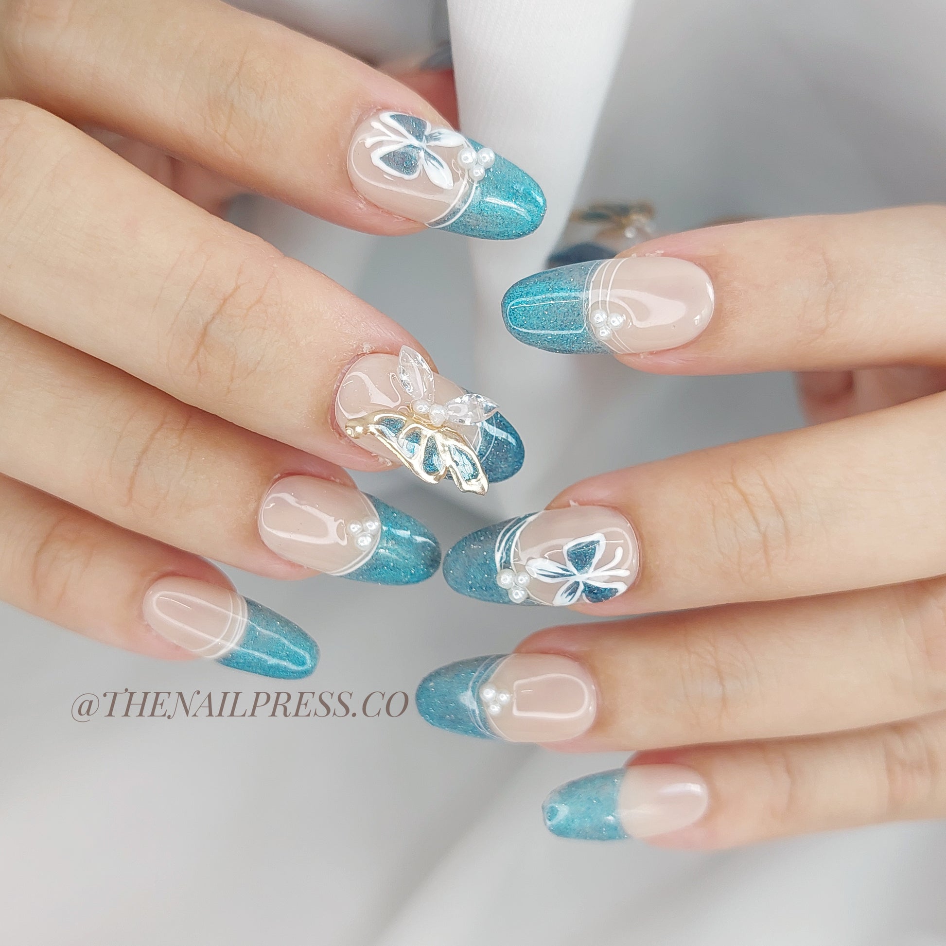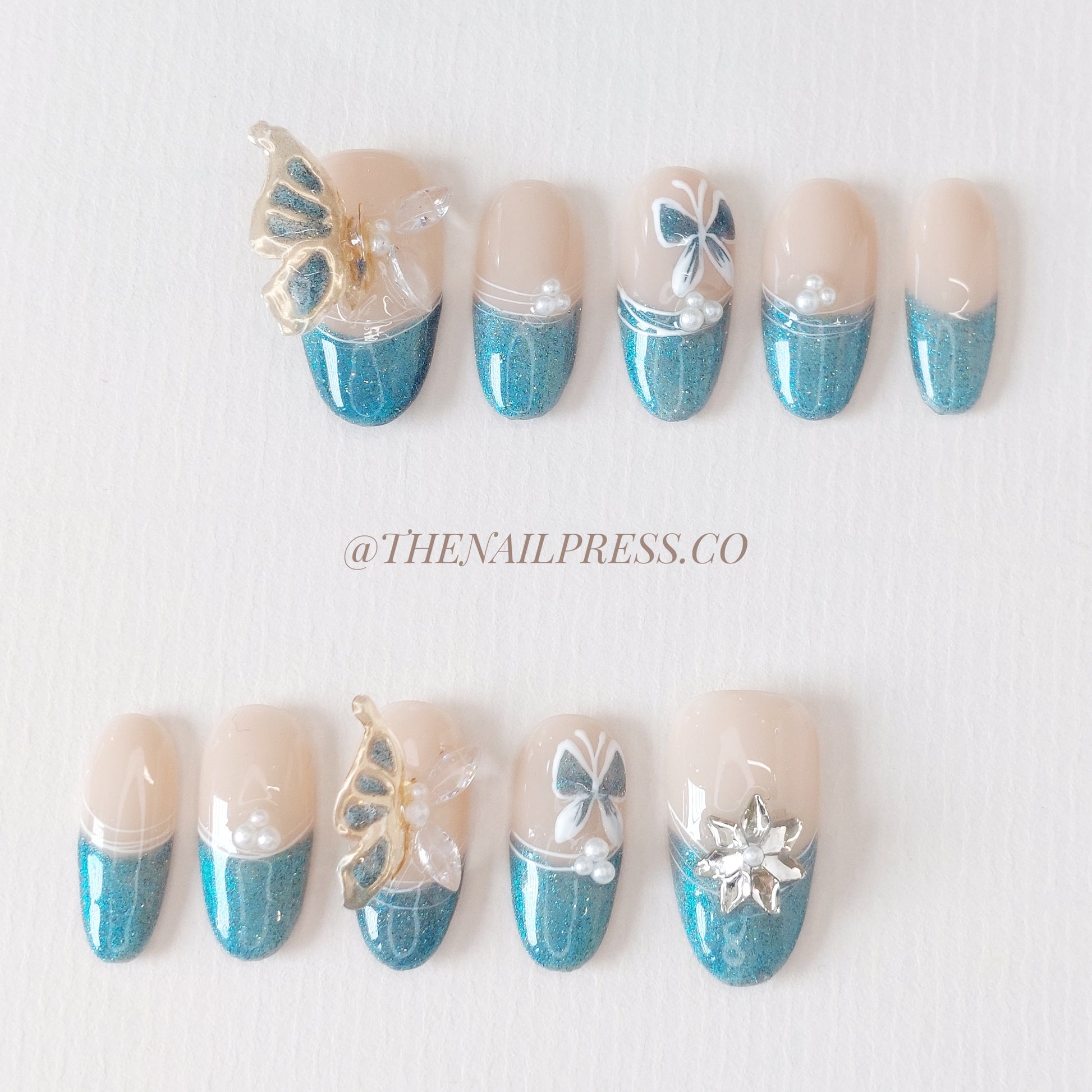 Blue cat-eye French tips with delicately hand-sculpted 3D butterfly wings create dreamy elegance in Butterfly Skies. The medium oval shape enhances the graceful, floating aesthetic. These handmade press-on nails are reusable and provide a salon-quality finish with effortless application.