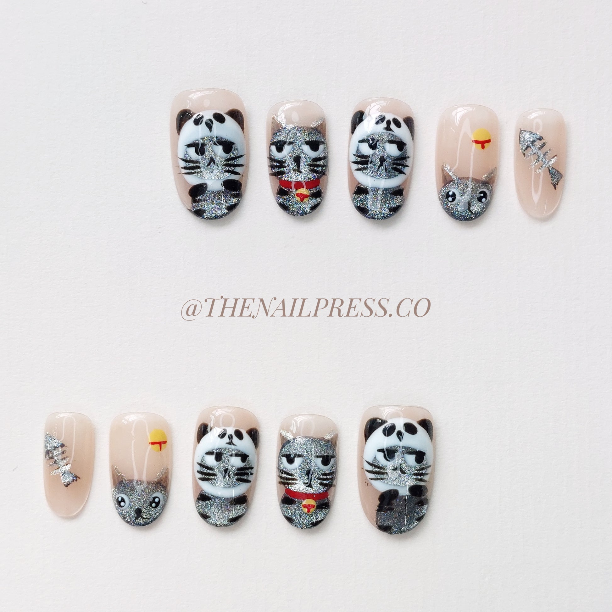 Show off your bold personality with Cattitude Vibes, where sass meets style. A hand-drawn cat with a playful eye-roll expression is paired with a stunning cat-eye effect, adding a touch of feline flair. The medium rounded shape provides a smooth, sophisticated finish, perfect for those who love fun combined with chic elegance. These handmade press-on nails offer a salon-quality finish with effortless application.