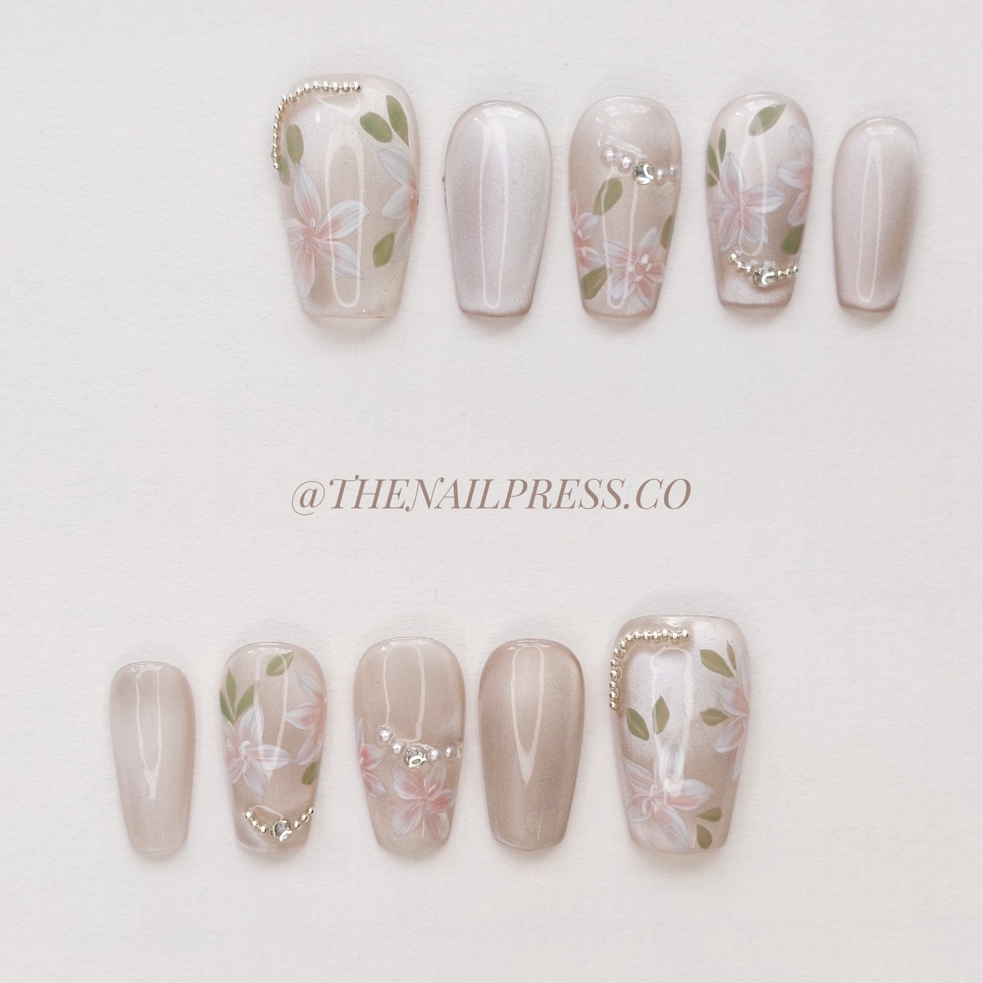 A glowy champagne cat-eye base paired with delicate, hand-painted florals creates a graceful, luxurious look in Champagne Bloom. The short coffin shape enhances the sophisticated shimmer and floral details, perfect for any occasion. These handmade press-on nails are reusable and offer a salon-quality finish for effortless beauty.