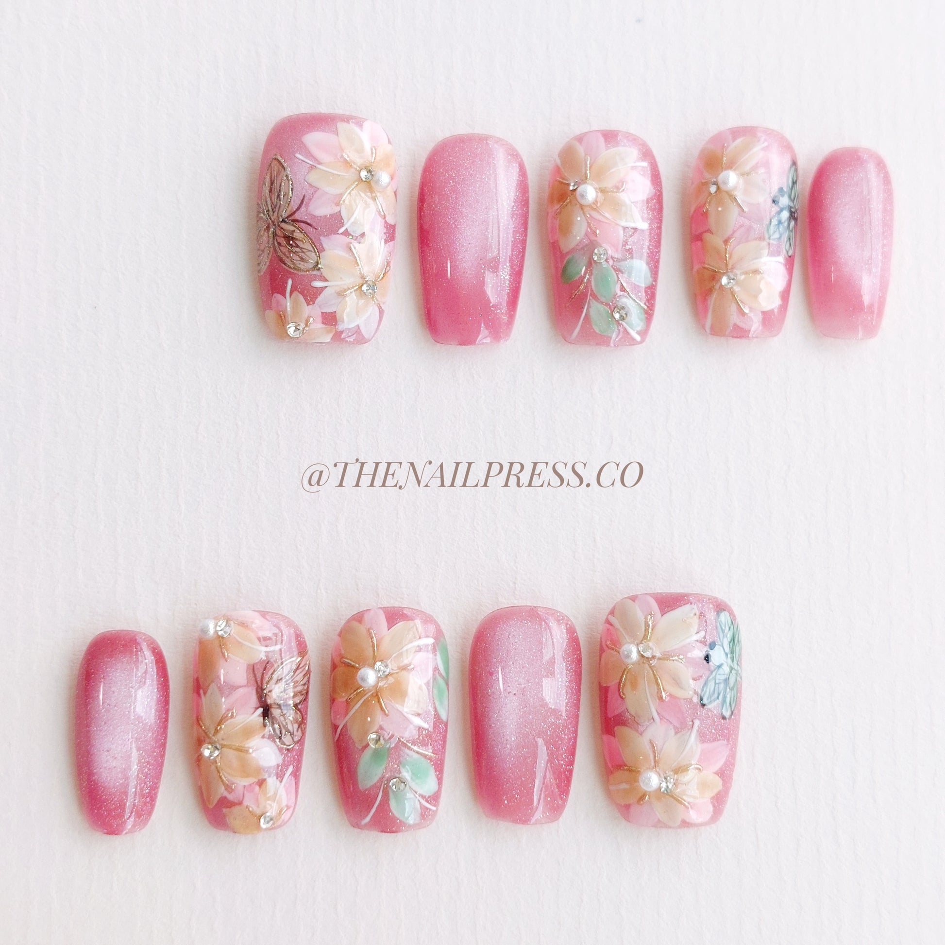 Embrace vibrant beauty with Charmed Petal Dance, where bright pink cat-eye shimmer forms a bold base accented with delicate florals and playful butterflies. The medium square shape enhances this whimsical design, perfect for making a statement with charm and elegance. Handmade and reusable, these nails deliver a salon-quality finish for effortlessly polished style.