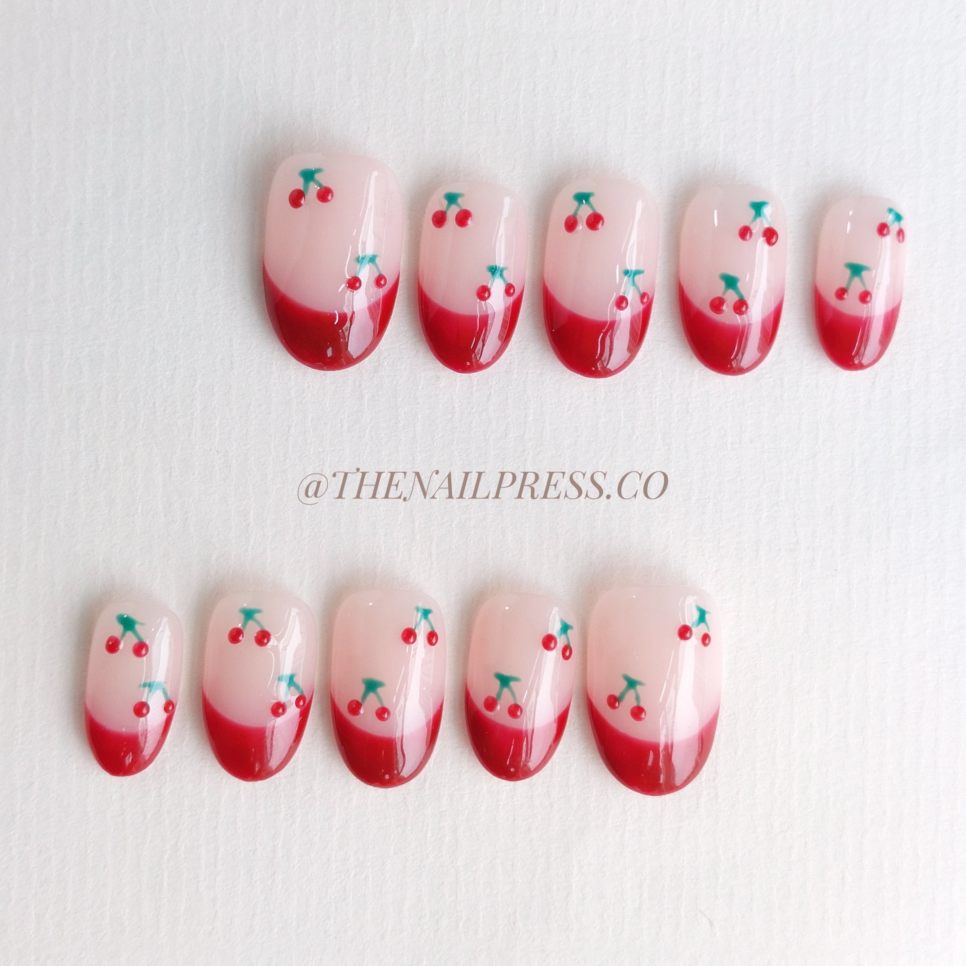 Add the perfect finishing touch with Cherry on Top, featuring bold red French tips and playful cherries. The medium rounded shape enhances its playful charm. These handmade press-on nails are crafted for effortless wear, delivering a polished, salon-quality finish.