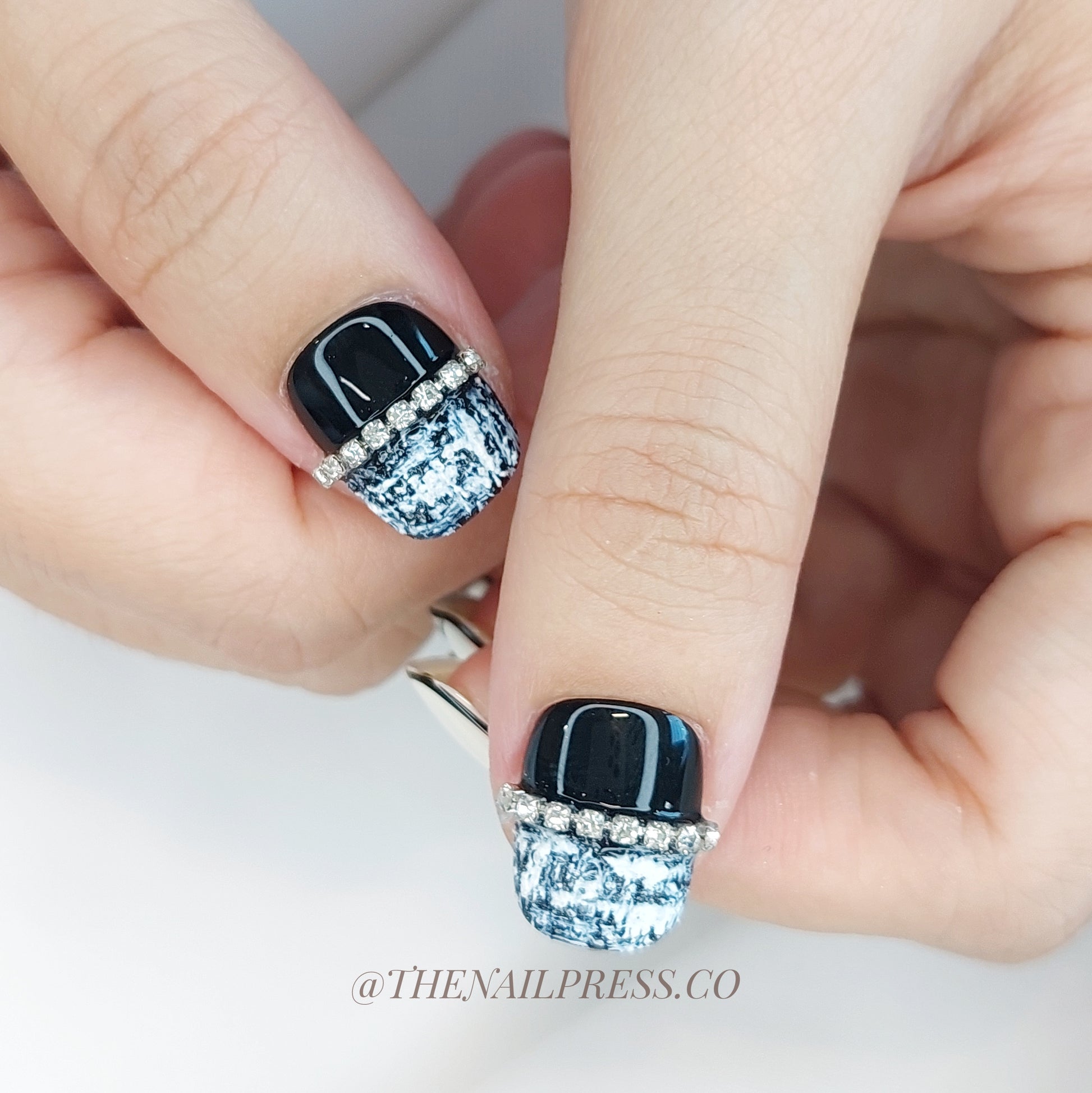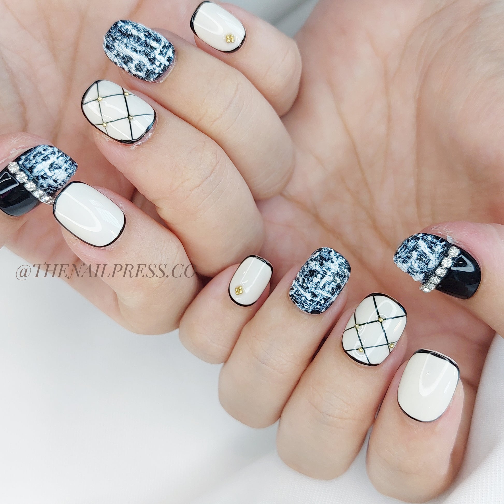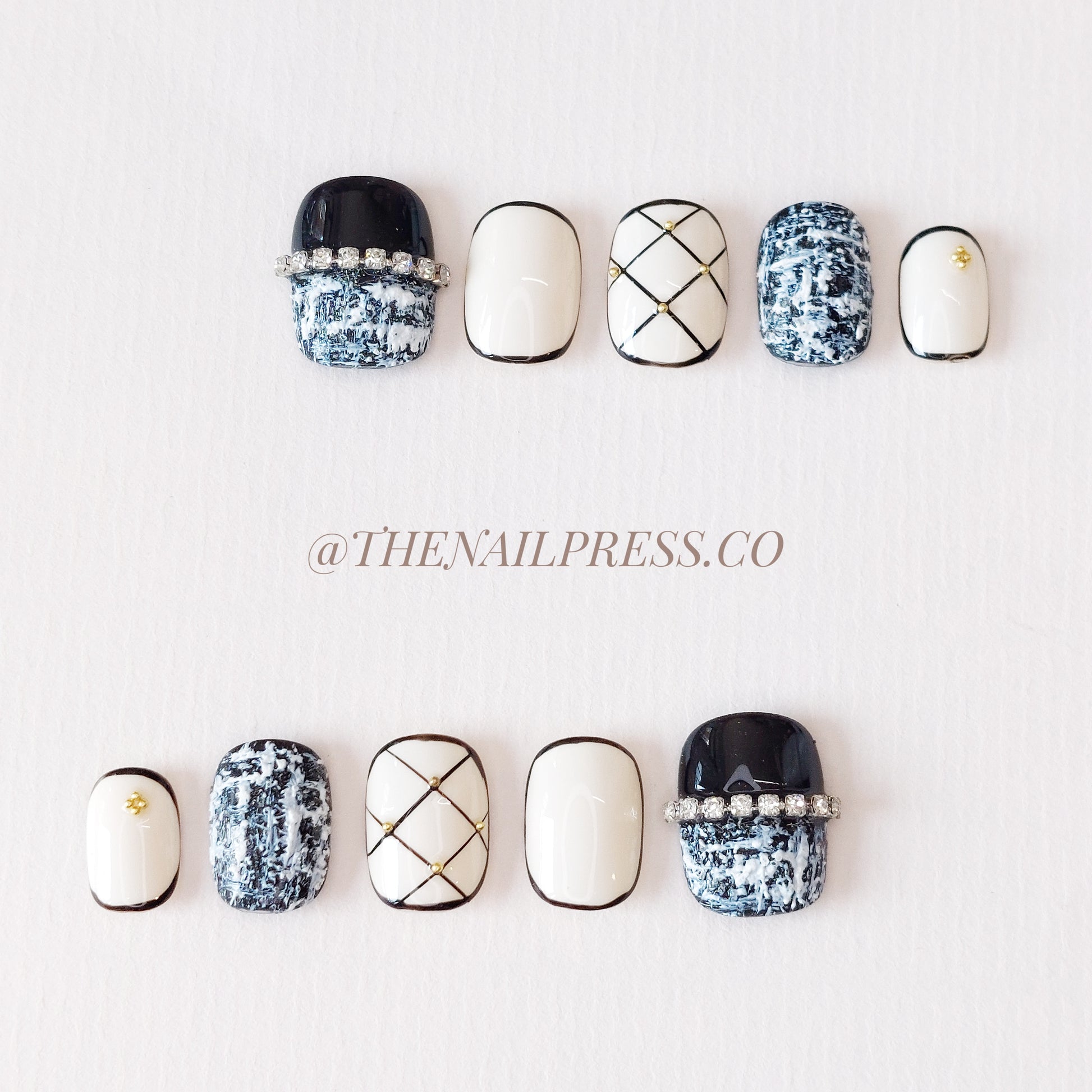 Bold black and white tones inspired by iconic fashion create the chic sophistication of Coco Classic. The short squoval shape offers a flattering, practical fit for everyday glamour. These handmade press-on nails offer a salon-quality finish with effortless application.
