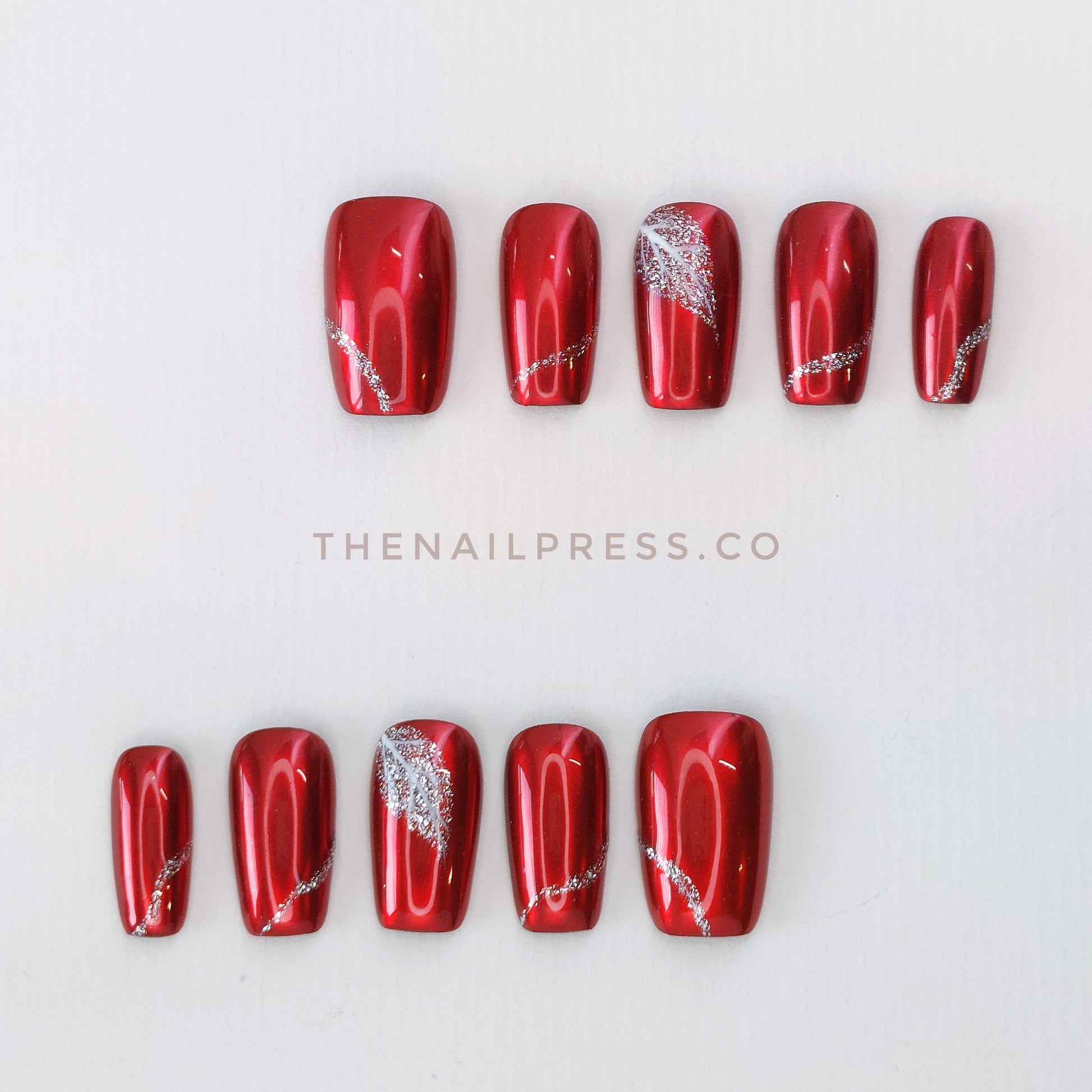 A rich, glossy crimson base paired with flowing silver glitter waves and a delicate shimmering accent creates an elegant, opulent look. The medium square shape enhances the bold, polished finish. These handmade press-on nails offer a salon-quality finish with effortless application.