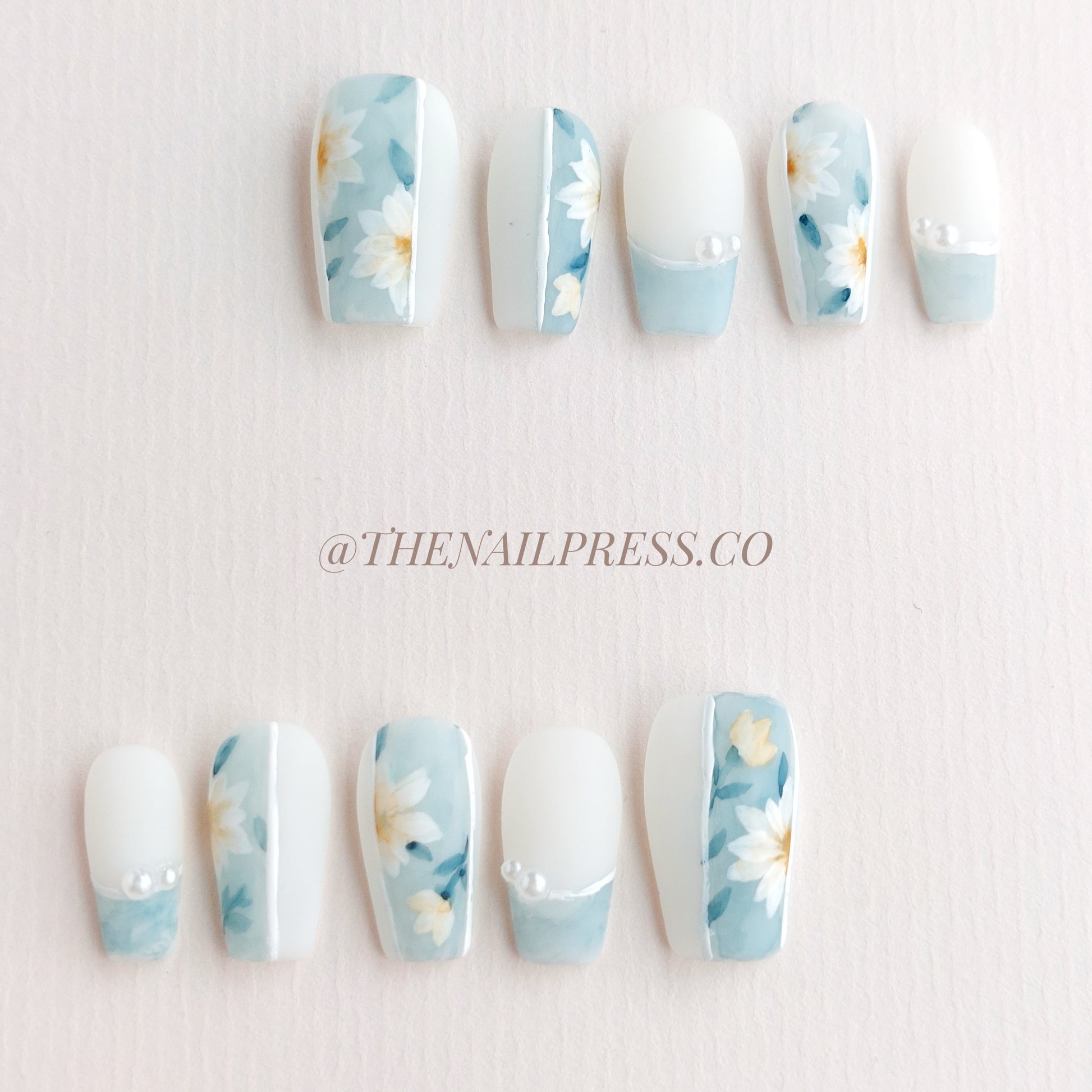 Escape to a blissful summer sky with Daisy Sky Dreams, featuring soft matte blue nails adorned with delicate white daisies. The gentle colours and floral motifs evoke serenity and carefree elegance. The short coffin shape provides a sleek, flattering silhouette, perfect for a polished, everyday style. Handcrafted and reusable, these nails deliver a salon-quality finish that keeps your fingertips effortlessly elegant.