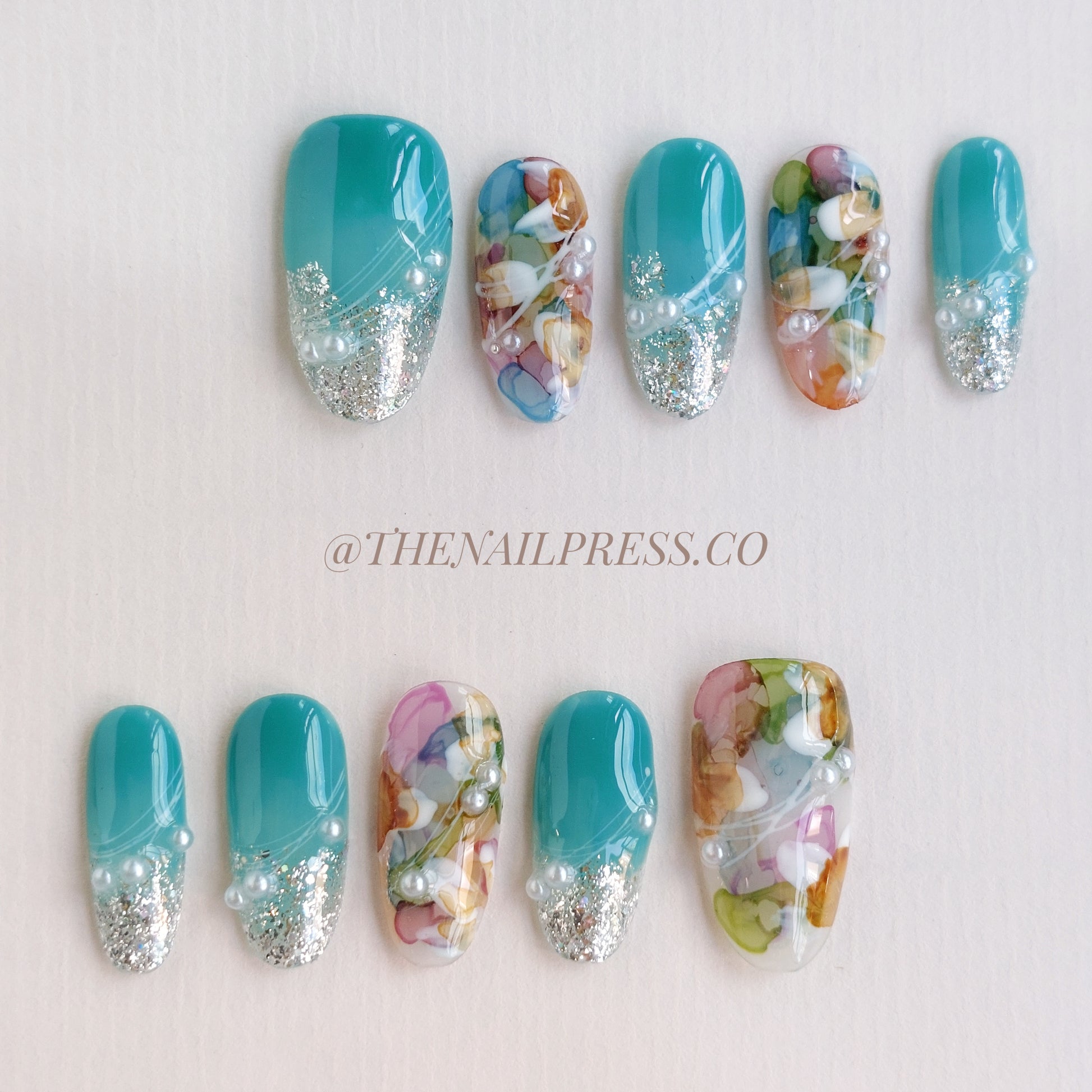 Step into a world of colour with Dazzling Dreamscape, featuring watercolour swirls of turquoise, purple, white, and green with a touch of silver glitter. The medium oval shape enhances its elegant charm. These handmade press-on nails are designed for effortless wear, providing a polished, salon-quality finish every time.