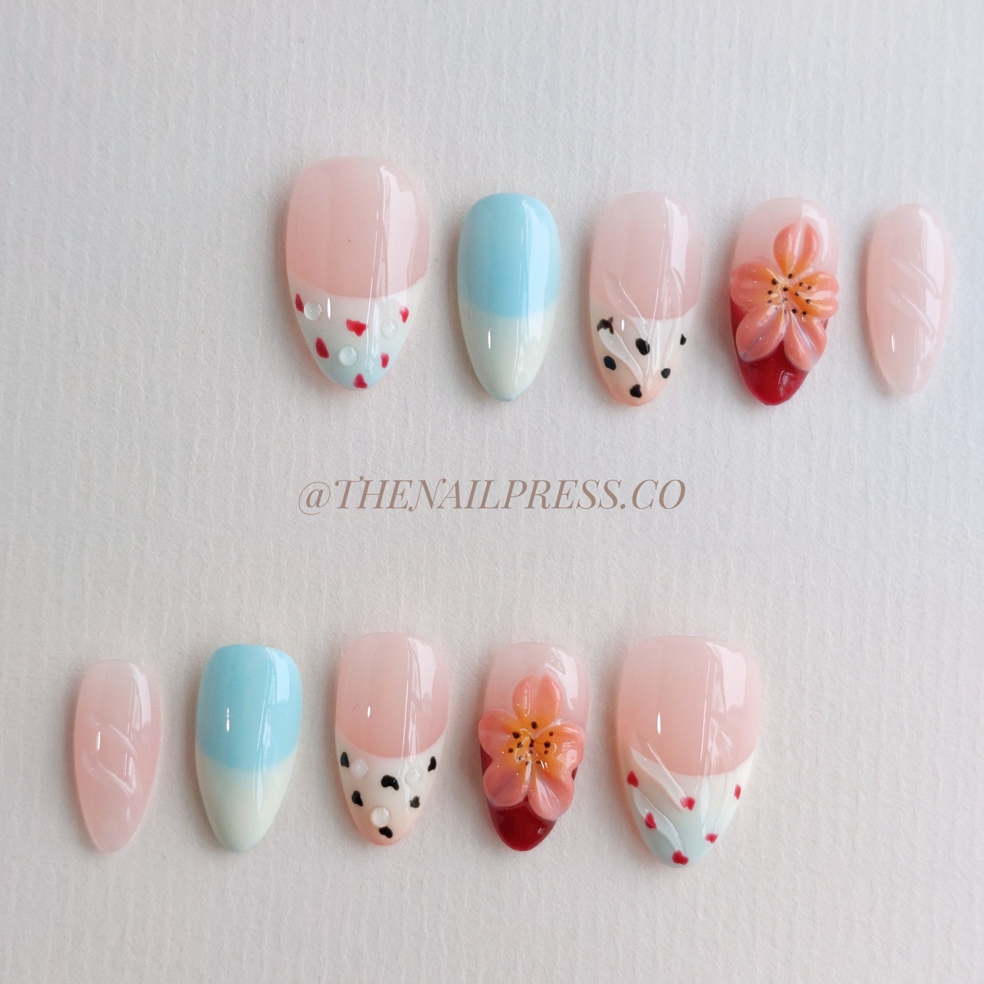 Experience the refreshing beauty of Dewy Tropical Blooms. Hand-sculpted tropical flowers shine with a dewy finish, set against a soft backdrop that evokes an early tropical morning. The short almond shape adds a vibrant, polished touch, perfect for bringing a burst of summer to your style. Handmade, reusable, and salon-quality for nails that look effortlessly beautiful and last all day.