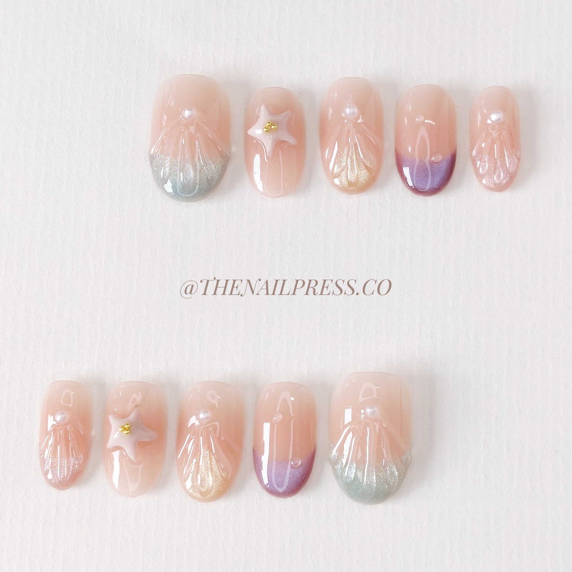 Soft pastel cat-eye French tips adorned with delicate seashells and hand-sculpted starfish capture the tranquil magic of Dreamy Coast. The medium oval rounded shape adds an elegant, effortless charm. These handmade press-on nails offer a salon-quality finish with effortless application.