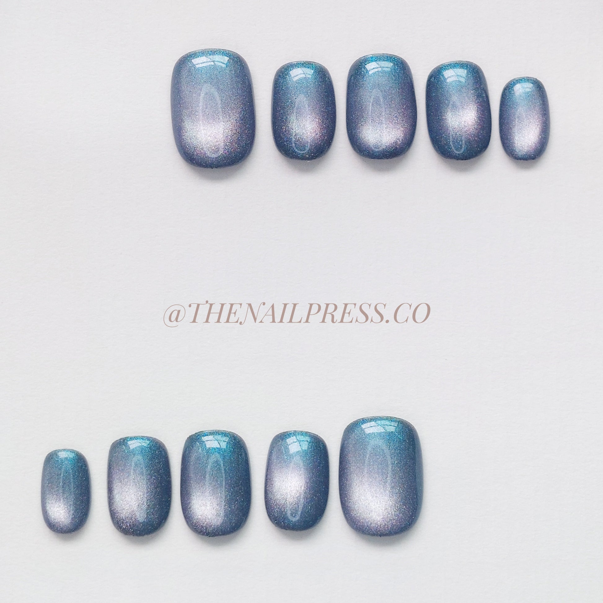 Deep twilight hues and a mesmerising cat-eye effect bring Dusky Galaxy Cat-Eye to life, creating a cosmic, multidimensional look. The short squoval shape enhances its shimmer, with tones of purple, blue, and stardust reflections shifting with every movement. These handmade press-on nails offer a salon-quality finish for effortlessly beautiful nails.