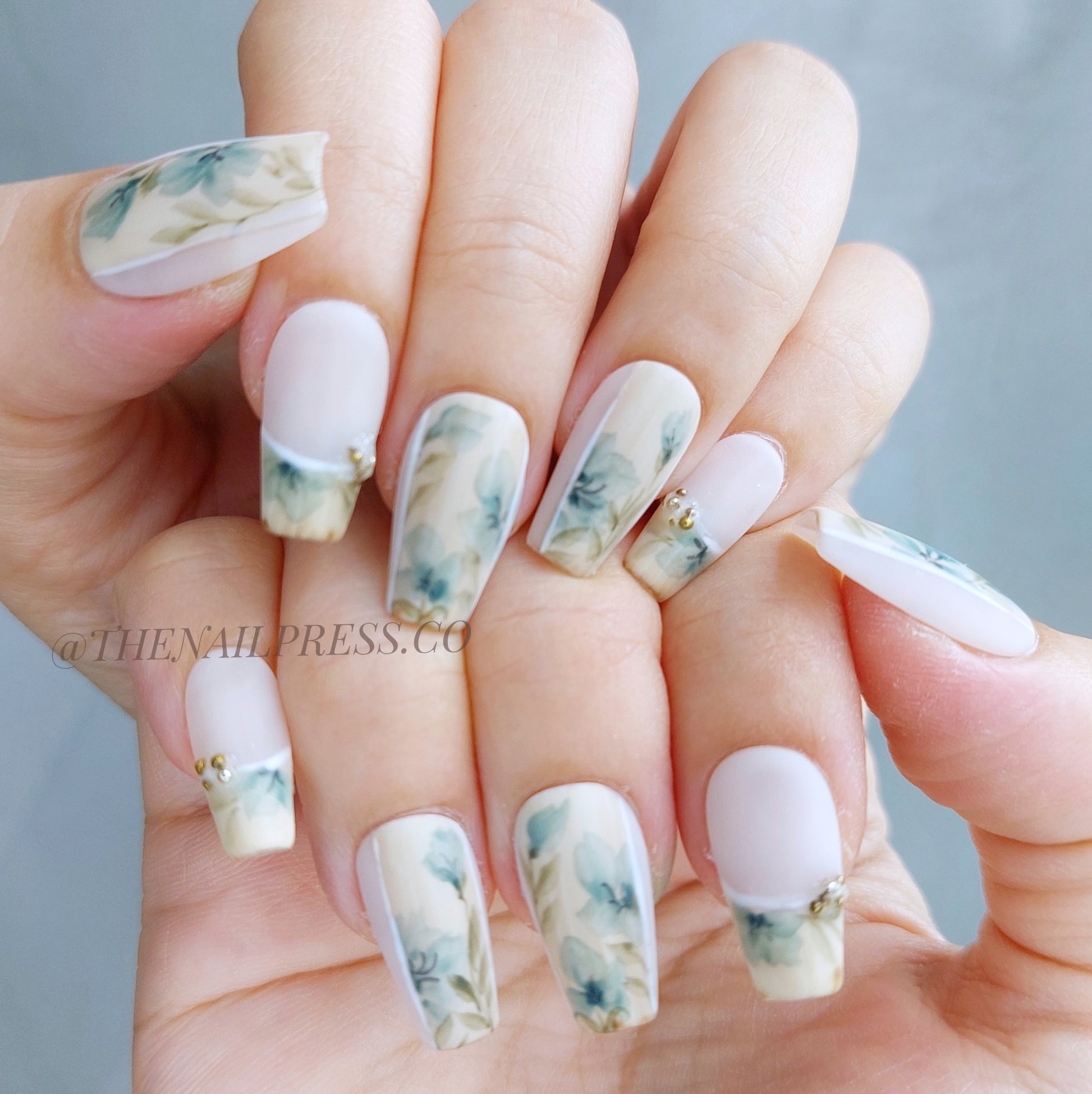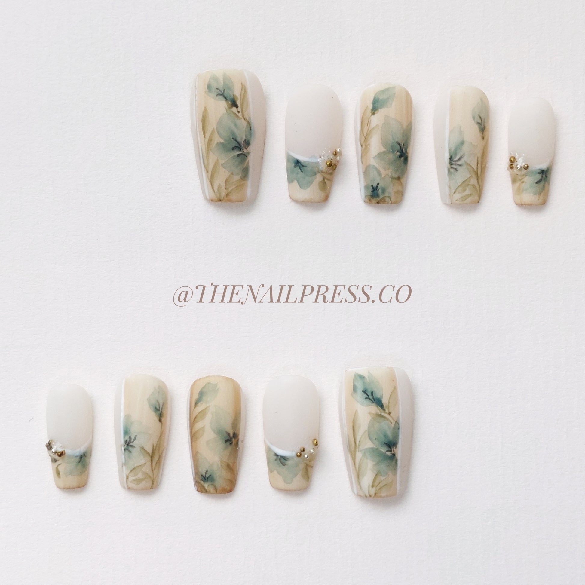 Step into timeless elegance with this delicate design. Soft watercolour florals in muted tones capture the nostalgic beauty of a vintage garden, while the short coffin shape adds a modern edge. Perfect for those who love soft florals with a contemporary touch. These handmade press-on nails provide a salon-quality finish with effortless application.