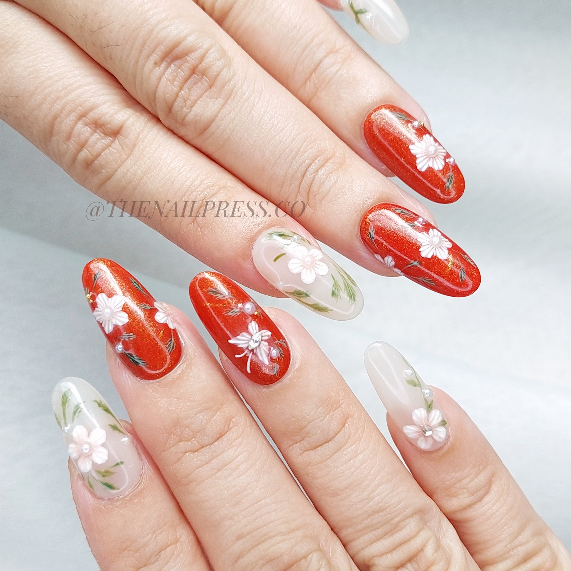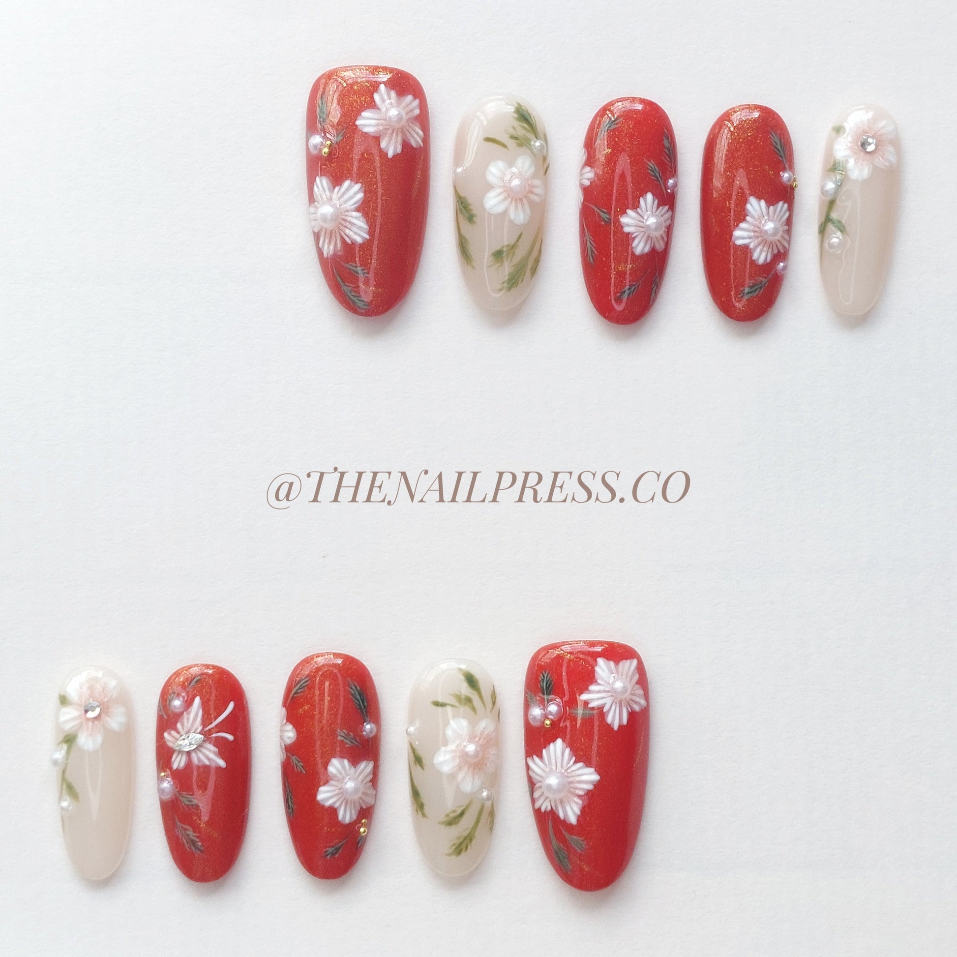 Celebrate cultural heritage with Eastern Embroidery, featuring delicate red cherry blossoms crafted to resemble traditional embroidery. The medium oval shape enhances the timeless beauty and refined sophistication of this design. Handcrafted and reusable, these nails provide a salon-quality finish for effortlessly polished style.