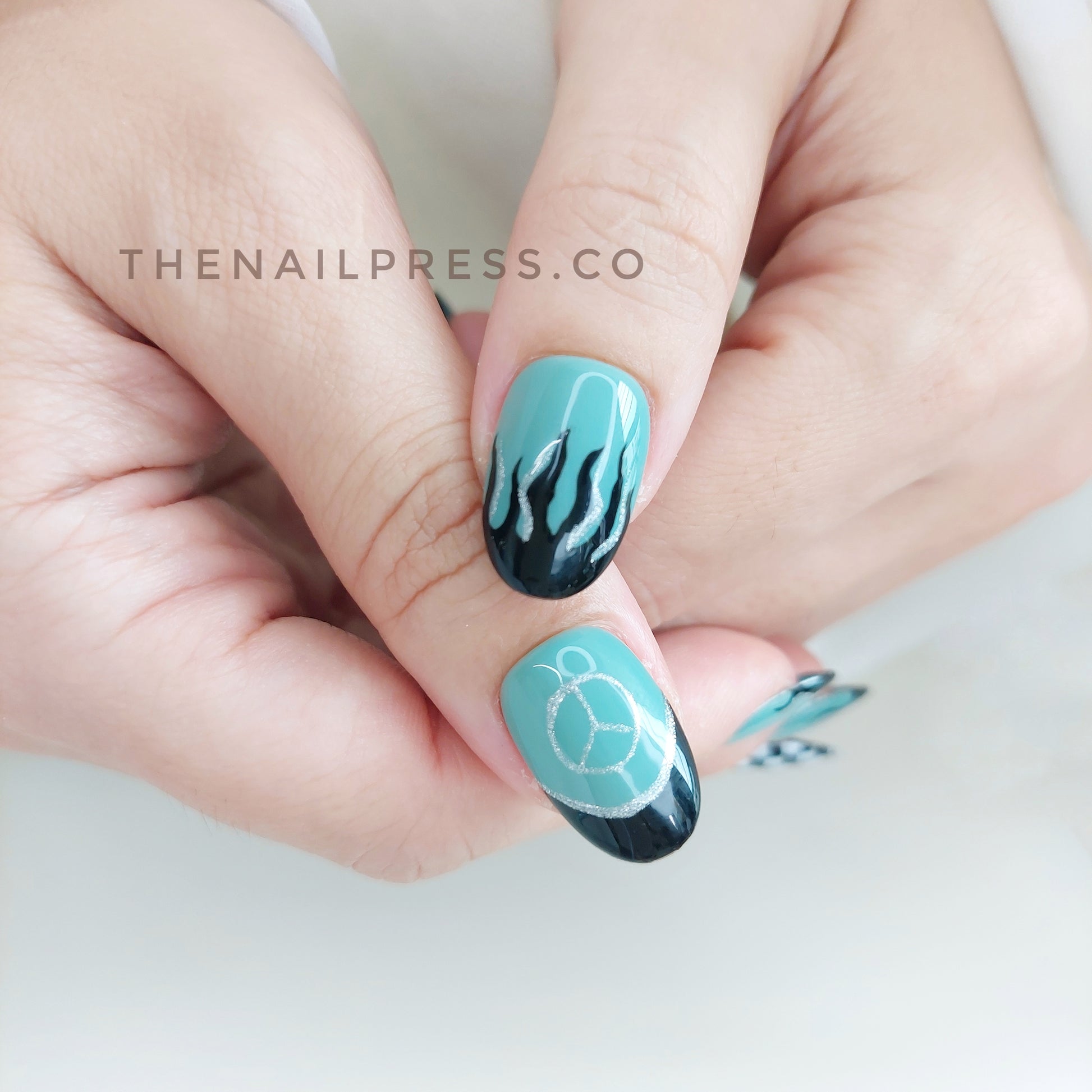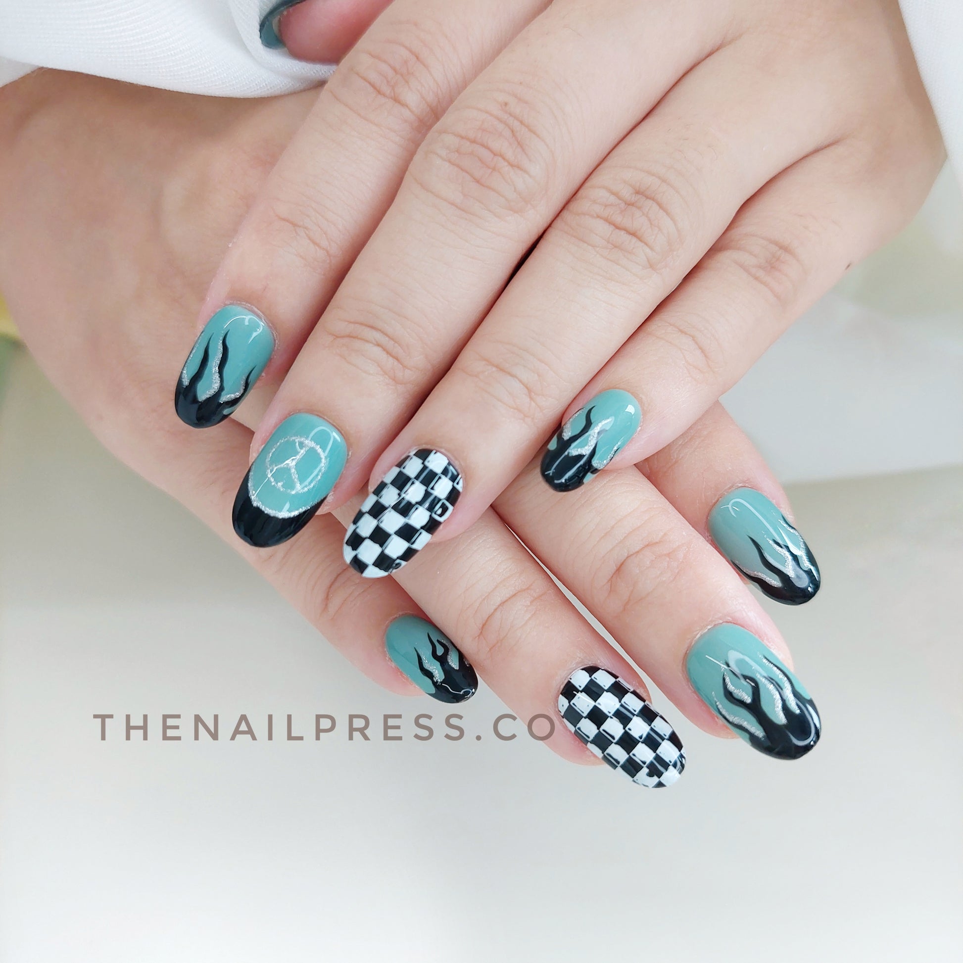 Teal nails inspired by F1 Mercedes are paired with black and silver flames and a striking checkered accent nail, creating a sleek, race-inspired look. The medium oval rounded shape enhances its polished, comfortable fit, perfect for fans of fast-paced style. These handmade press-on nails provide a salon-quality finish with effortless application.