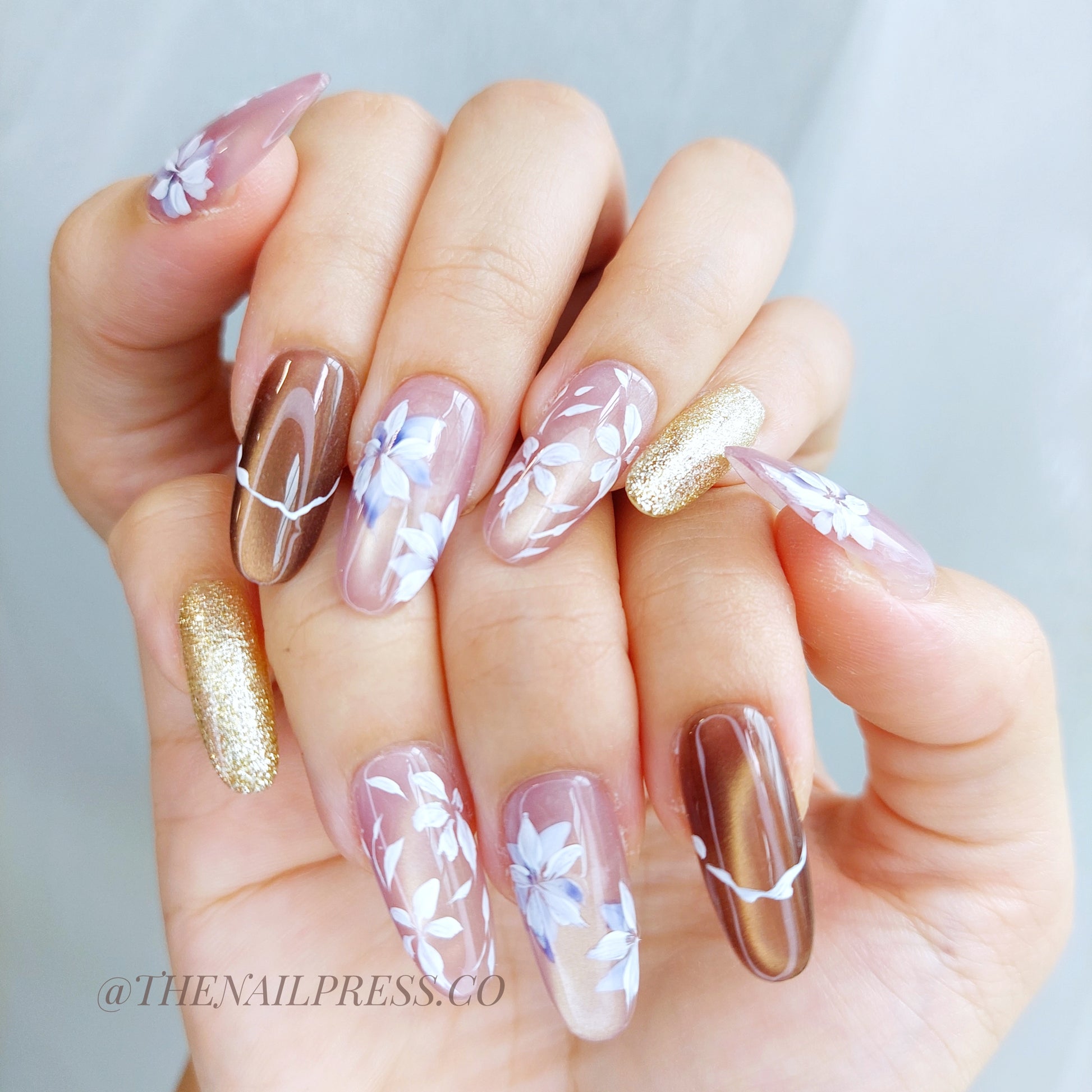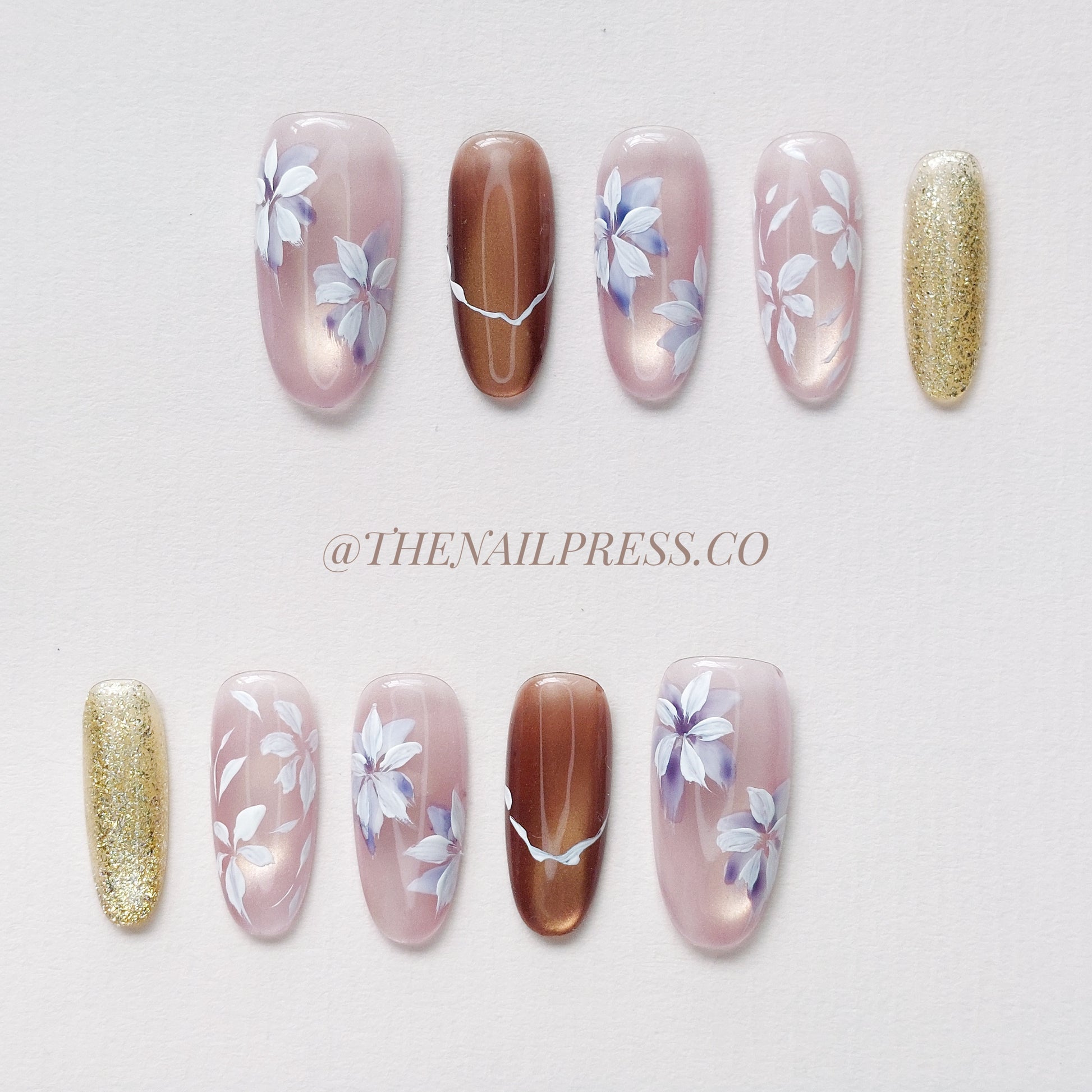 Unveil a captivating blend of elegance and vibrancy with Floraglow. A luminous cat-eye base glows with subtle light shifts and is adorned with delicate hand-painted florals. A gold shimmer accent adds a touch of opulence, while the medium oval shape enhances its soft, graceful silhouette. These handmade press-on nails offer a salon-quality finish with effortless application.