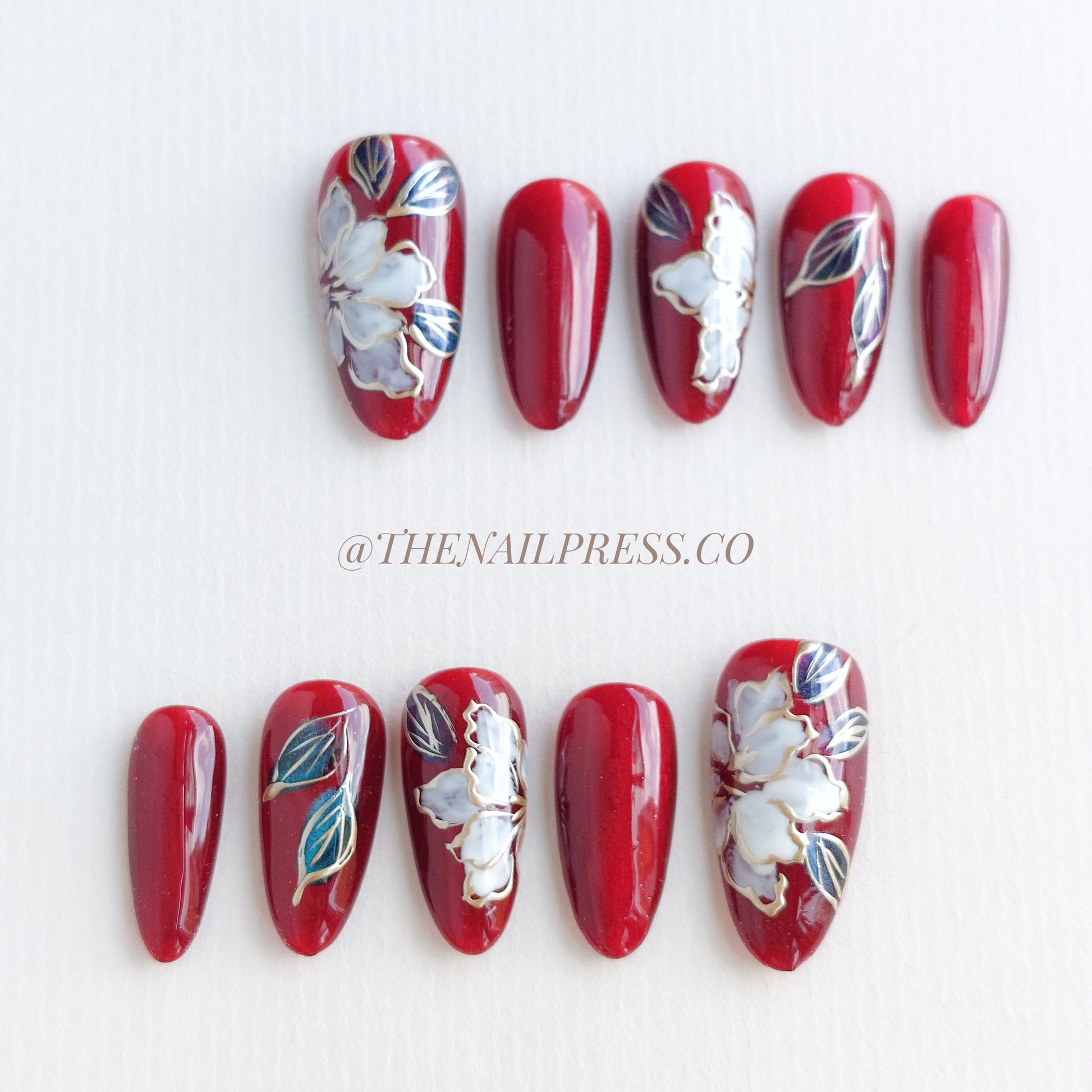 Embrace the spirit of prosperity with Floral Abundance. Featuring a rich red cat-eye base and intricate oriental gold-lined flowers, this design blends tradition and elegance. The medium oval shape enhances its timeless beauty. Handcrafted and reusable, these nails offer a salon-quality finish for effortlessly polished style.