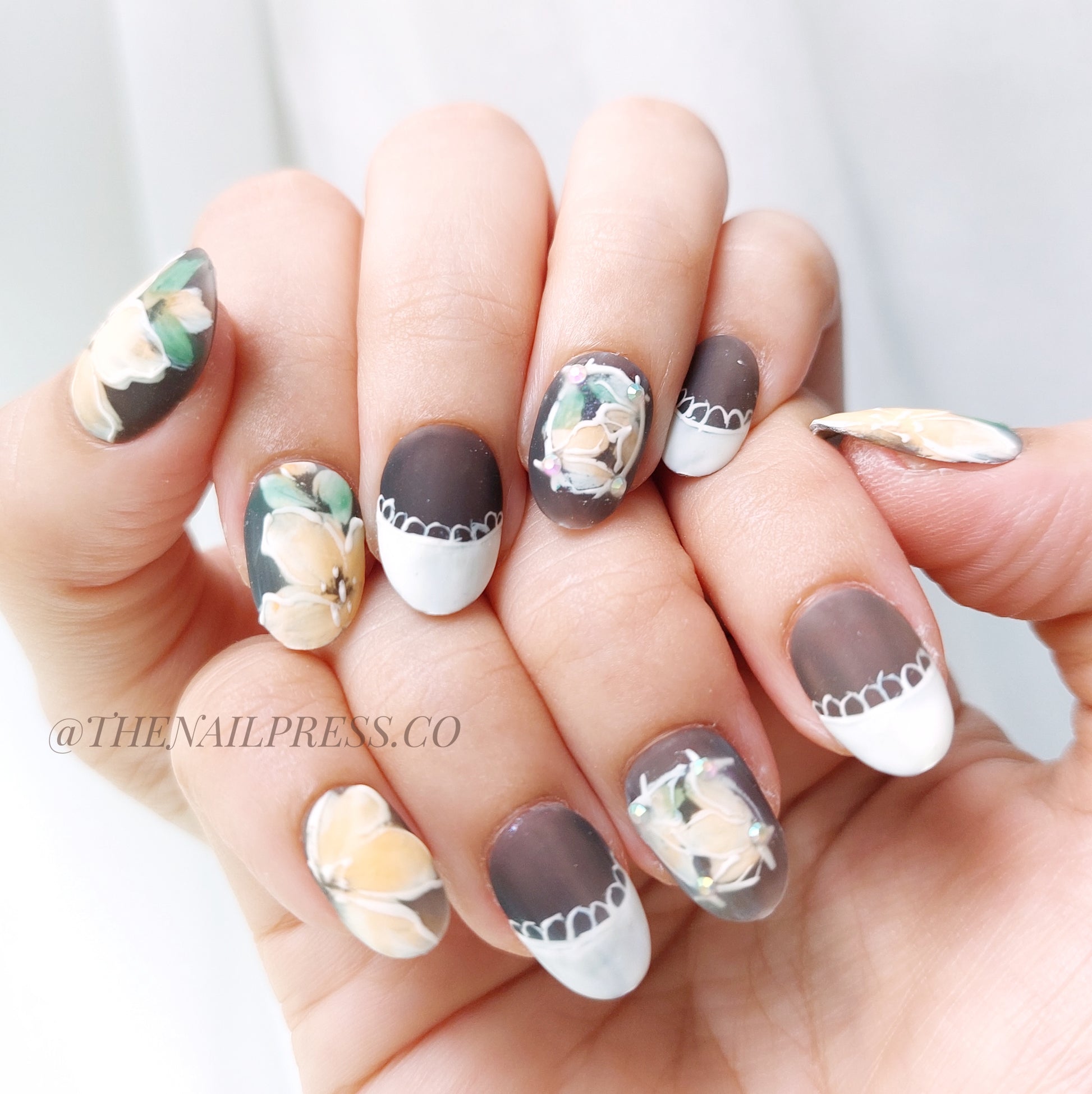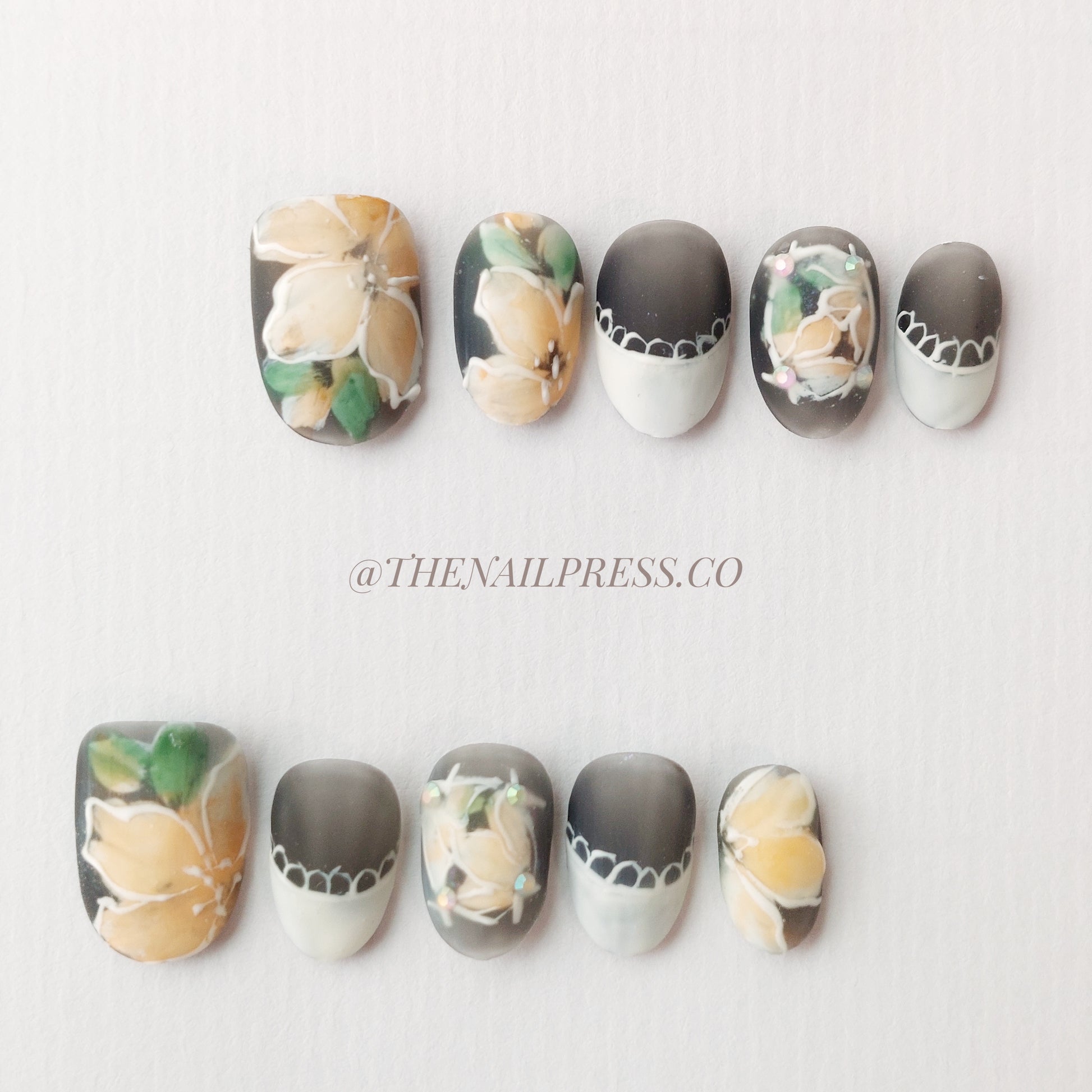 Intricate lace meets floral elegance in Floral Lace Artistry. Matte black nails feature detailed lace and delicate florals, blending artistry with classic sophistication. Short rounded shape offers a flattering silhouette suitable for any occasion. Handmade, reusable, and salon-quality for nails that look refined and elegant in minutes.