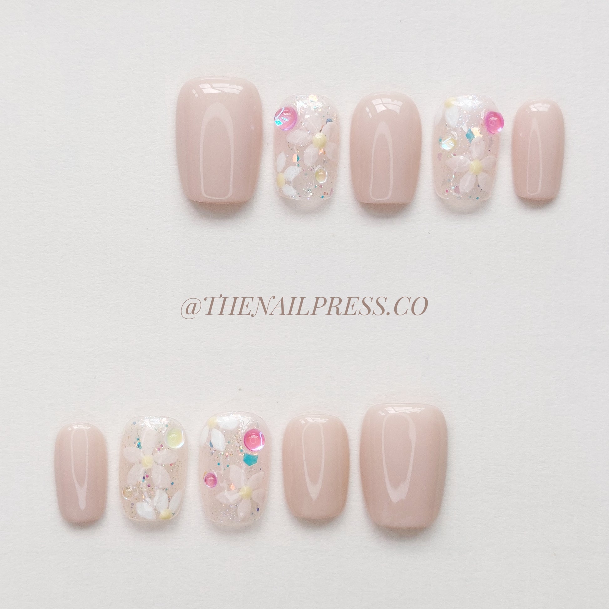 Nude pink nails accented with simple florals and delicate sparkles create a playful, feminine look in Floral Wink. The short square shape enhances its cute, youthful vibe. These handmade press-on nails are reusable and offer a salon-quality finish for effortless beauty.
