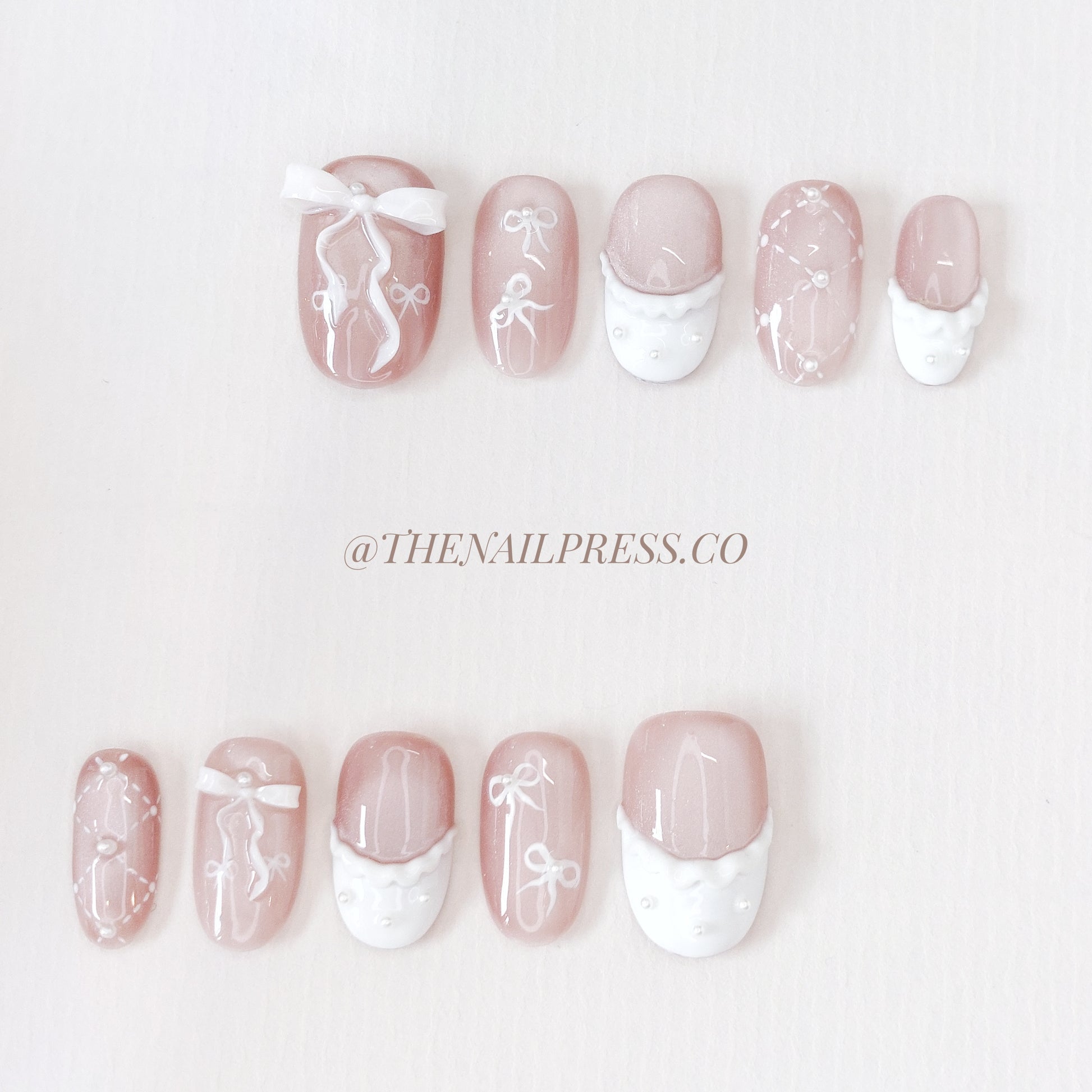A soft pink cat-eye base with white French tips, dainty bows, and frilly details creates playful, flirty charm in Frill Me Up. The medium oval rounded shape adds timeless elegance. These handmade press-on nails are reusable and provide a salon-quality finish with effortless application.