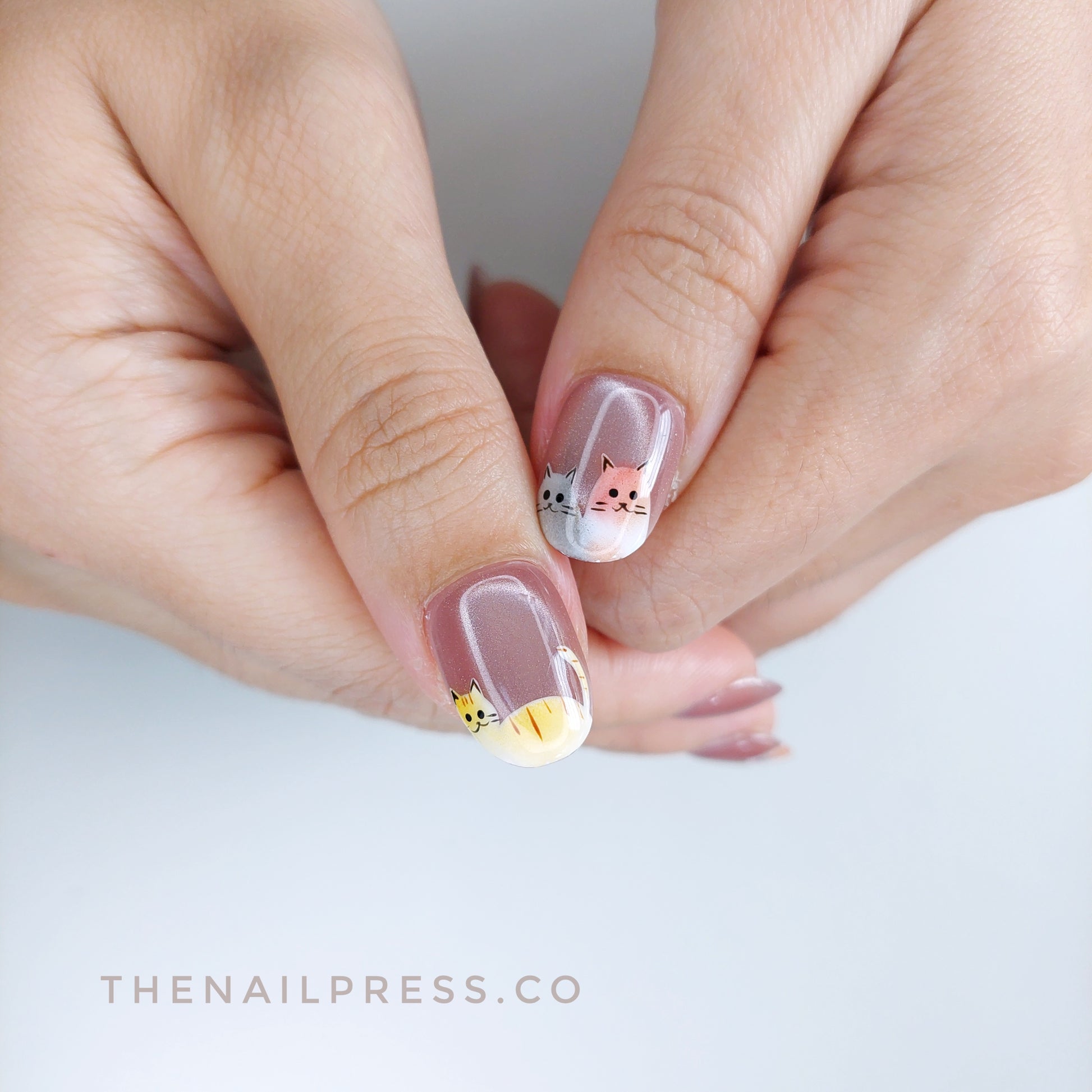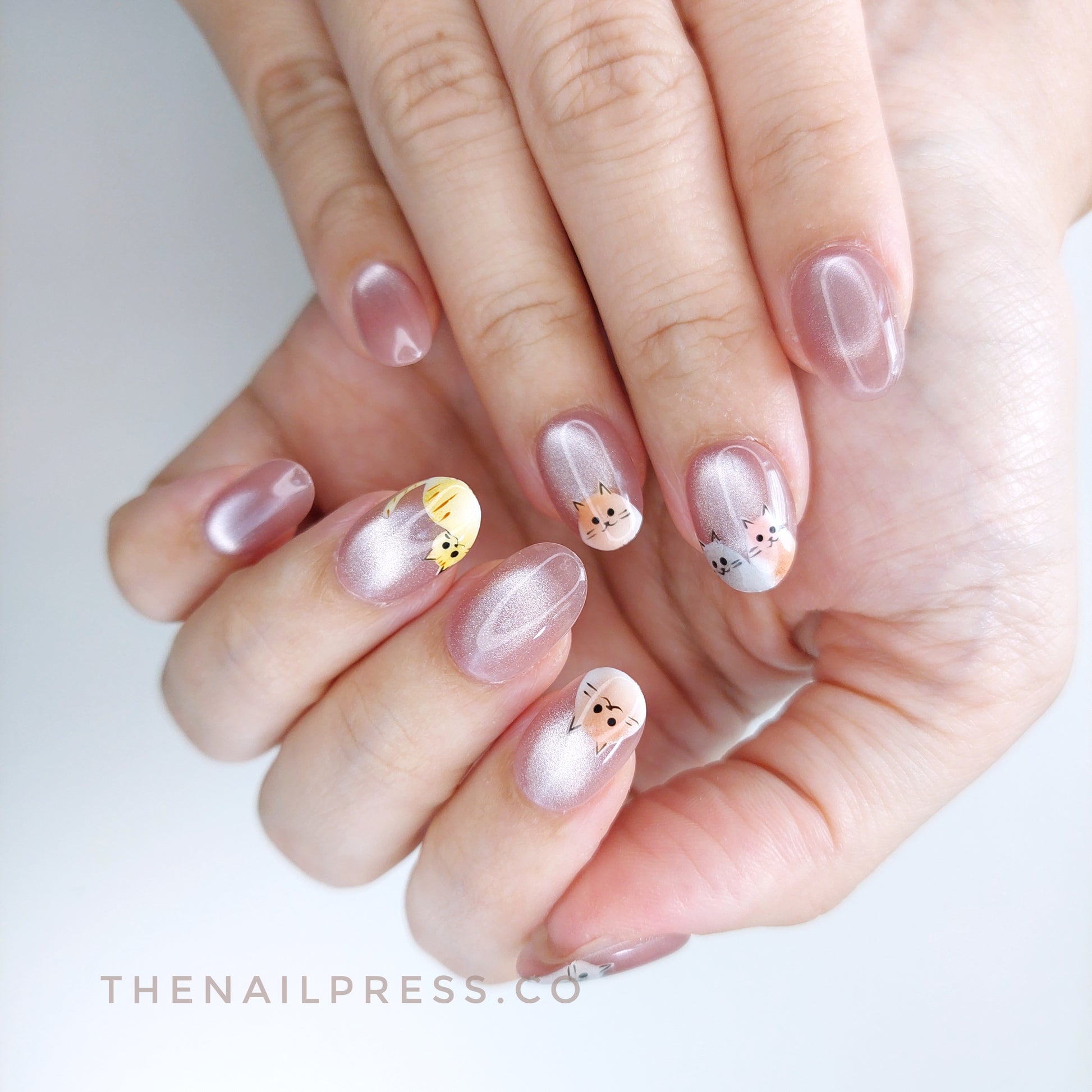Glowy pink cat-eye nails feature playful cats peeking from the tips, creating a fun and whimsical look. Frisky Glow brings lively, mischievous charm to your nails, offered in a short rounded shape for a chic, polished finish. These handmade press-on nails offer a salon-quality finish with effortless application.