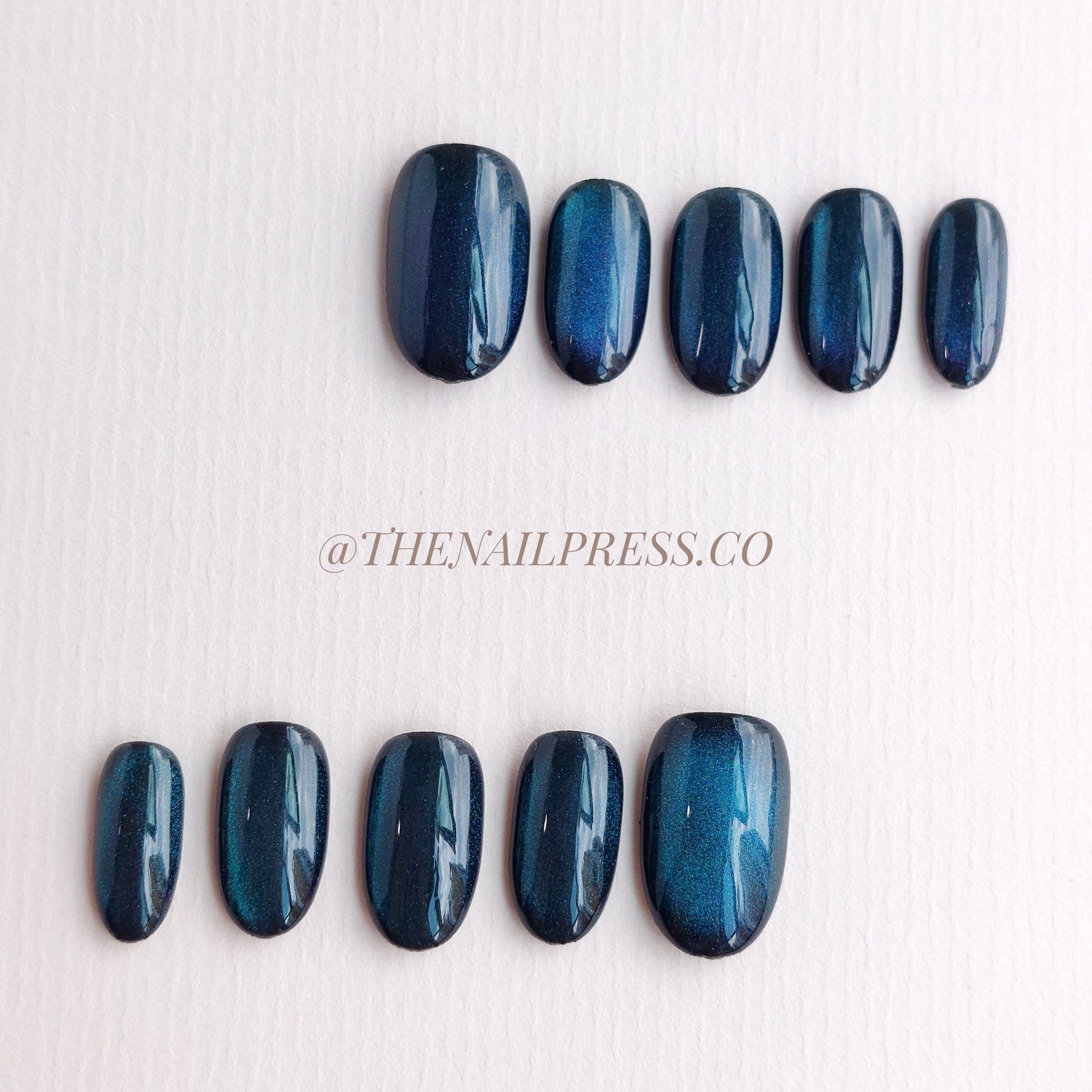 Unveil the mystique of Galaxy Glow Cat-Eye. Shimmering midnight blue and interstellar purple combine in a cat-eye effect that shifts with the light, creating a captivating, cosmic look. Short rounded and medium oval rounded shapes provide flattering silhouettes for a polished, mesmerising finish. Handcrafted and reusable, these nails deliver a salon-quality look for effortlessly striking style.