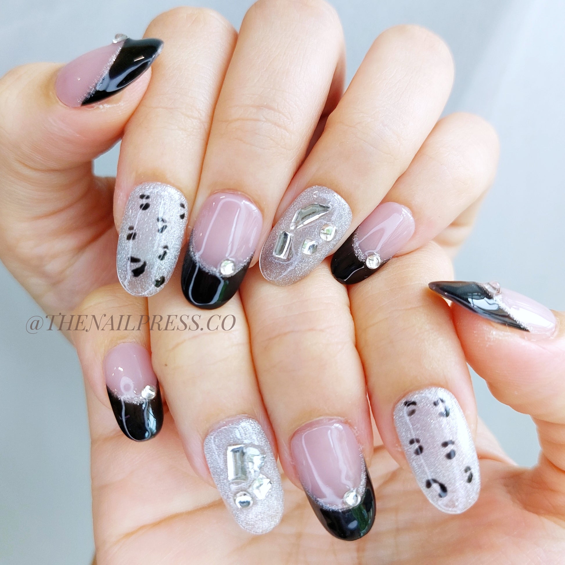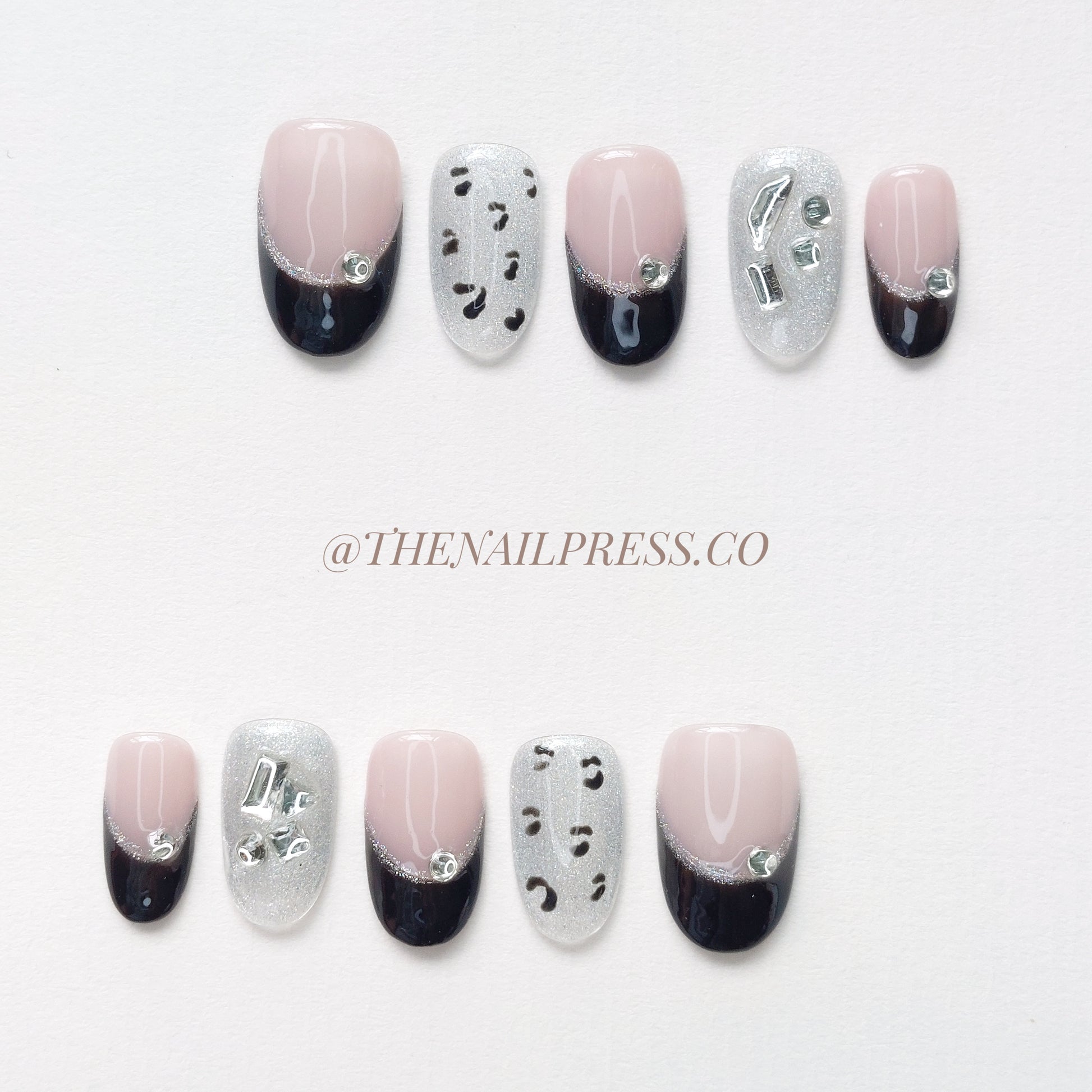 Unleash your inner power with Glam Huntress. Bold black French tips are paired with sultry leopard print accents and sparkling gem embellishments for a fierce, glamorous look. The medium rounded shape enhances its confident, polished vibe, perfect for those who love making a statement with sophisticated edge. These handmade press-on nails offer a salon-quality finish with effortless application.