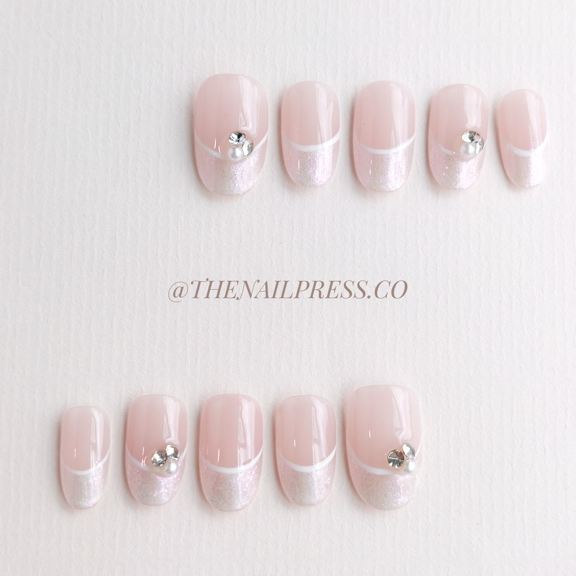 Unleash your inner sparkle with Glimmer & Gems. Glittery French tips combined with dazzling stones create a shimmering, sophisticated look that stands out from every angle. Medium oval rounded shape provides a flattering, luxurious silhouette. Handcrafted and reusable, these nails deliver a salon-quality finish for effortlessly glamorous style.