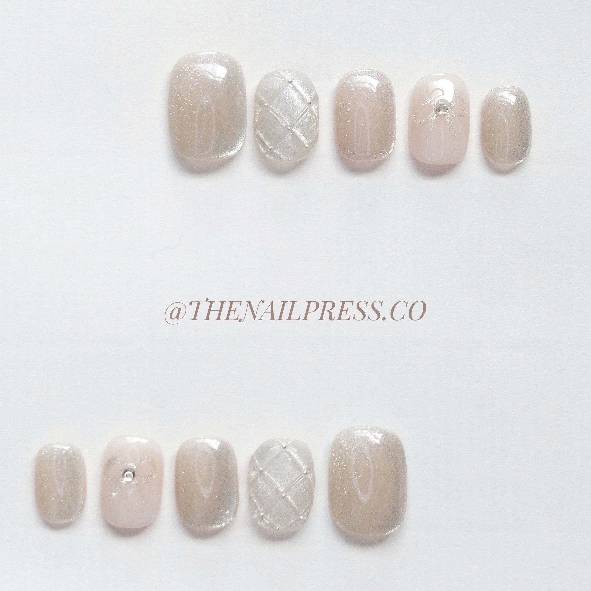 Radiate elegance with Glittering Grace, featuring a sparkling silver base accented with subtle details for a timeless, sophisticated look. The short squoval shape adds a graceful finish, perfect for polished and refined nails. These handmade press-on nails offer a salon-quality finish with effortless application.
