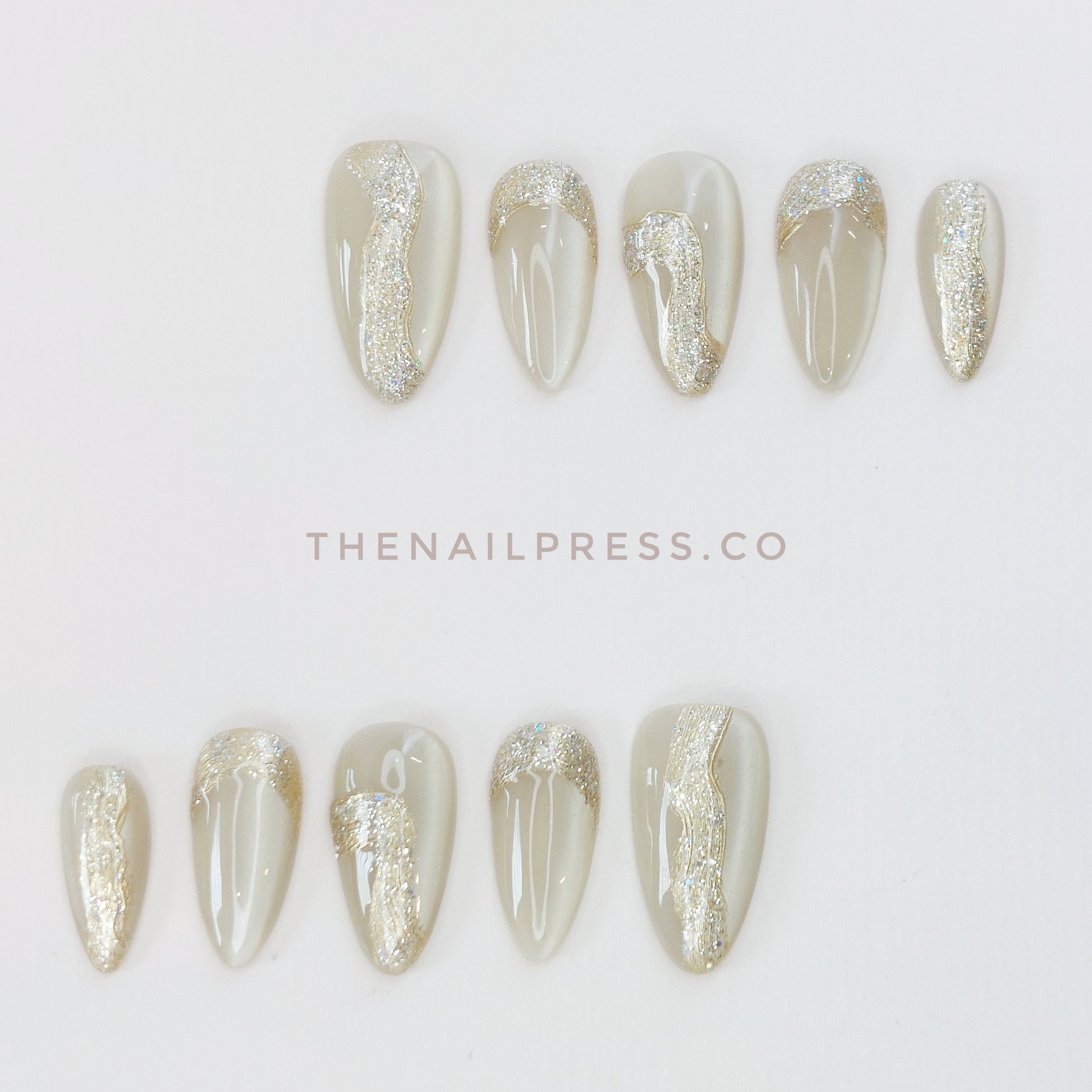 A soft champagne cat-eye base kissed with flowing gold-dust shimmer creates a look of elegant, subtle opulence. The short almond shape enhances its refined, graceful finish. These handmade press-on nails offer a salon-quality finish with effortless application.