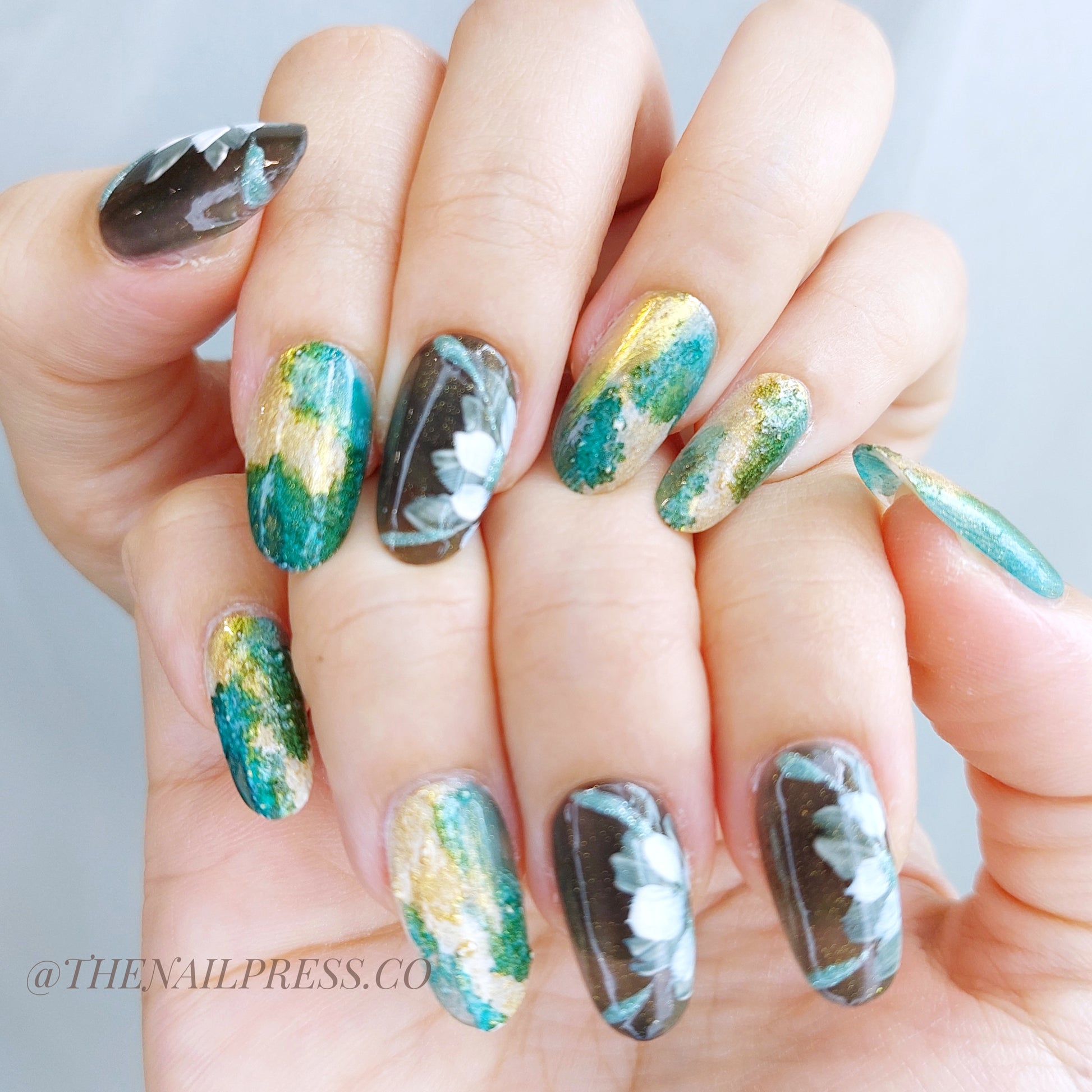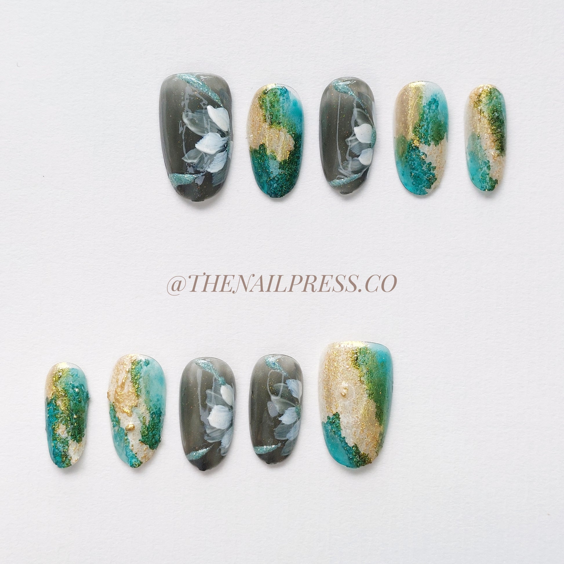 Step into natural elegance with Golden Eden. A rich blend of green and gold tones is enhanced with textured accents and delicate floral details, evoking the timeless beauty of a lush, enchanted garden. The medium oval rounded shape adds a graceful silhouette, perfect for those who adore refined botanical luxury. These handmade press-on nails offer a salon-quality finish with effortless application.