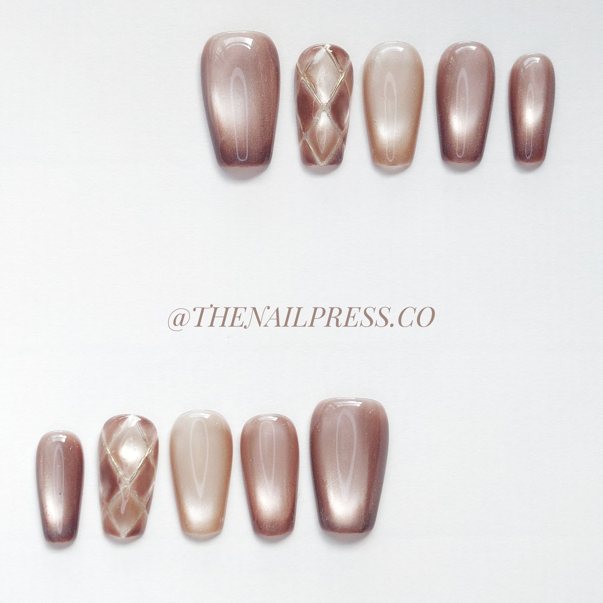 Bold yet refined, Grid of Glam features a diamond checkered pattern paired with rich brown cat-eye shimmer. The geometric design adds a modern edge, while the luxe finish enhances its elegance. The short coffin shape complements its chic appeal. These handmade press-on nails provide a salon-quality finish with effortless application.