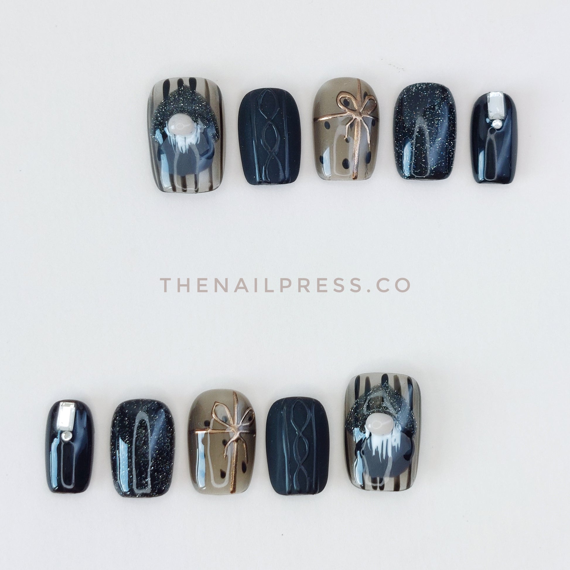 Playful hand-drawn gnome and intricately detailed presents sit on a sleek black base, accented with glitter finishes and a matte, knit-inspired design for a festive, whimsical look. The short square shape adds a cute, polished finish. These handmade press-on nails offer a salon-quality finish with effortless application.