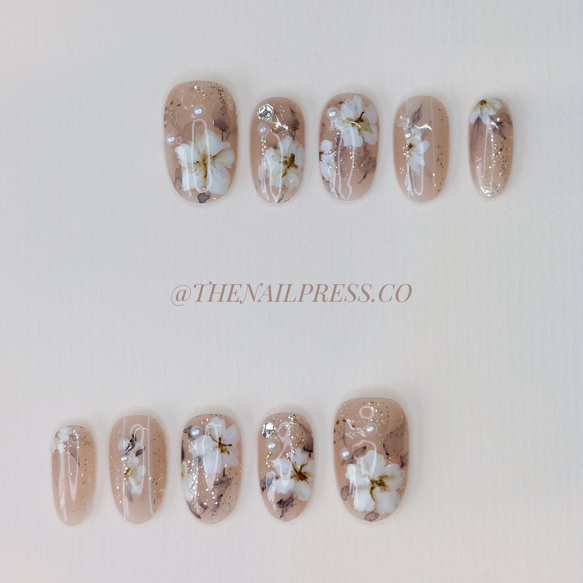 A soft ivory base adorned with delicate, intricate white florals evokes the serene beauty of a peaceful garden in Ivory Garden. The medium oval rounded shape adds a classic, flattering silhouette perfect for any occasion. These handmade press-on nails are reusable and offer a salon-quality finish for effortless beauty.