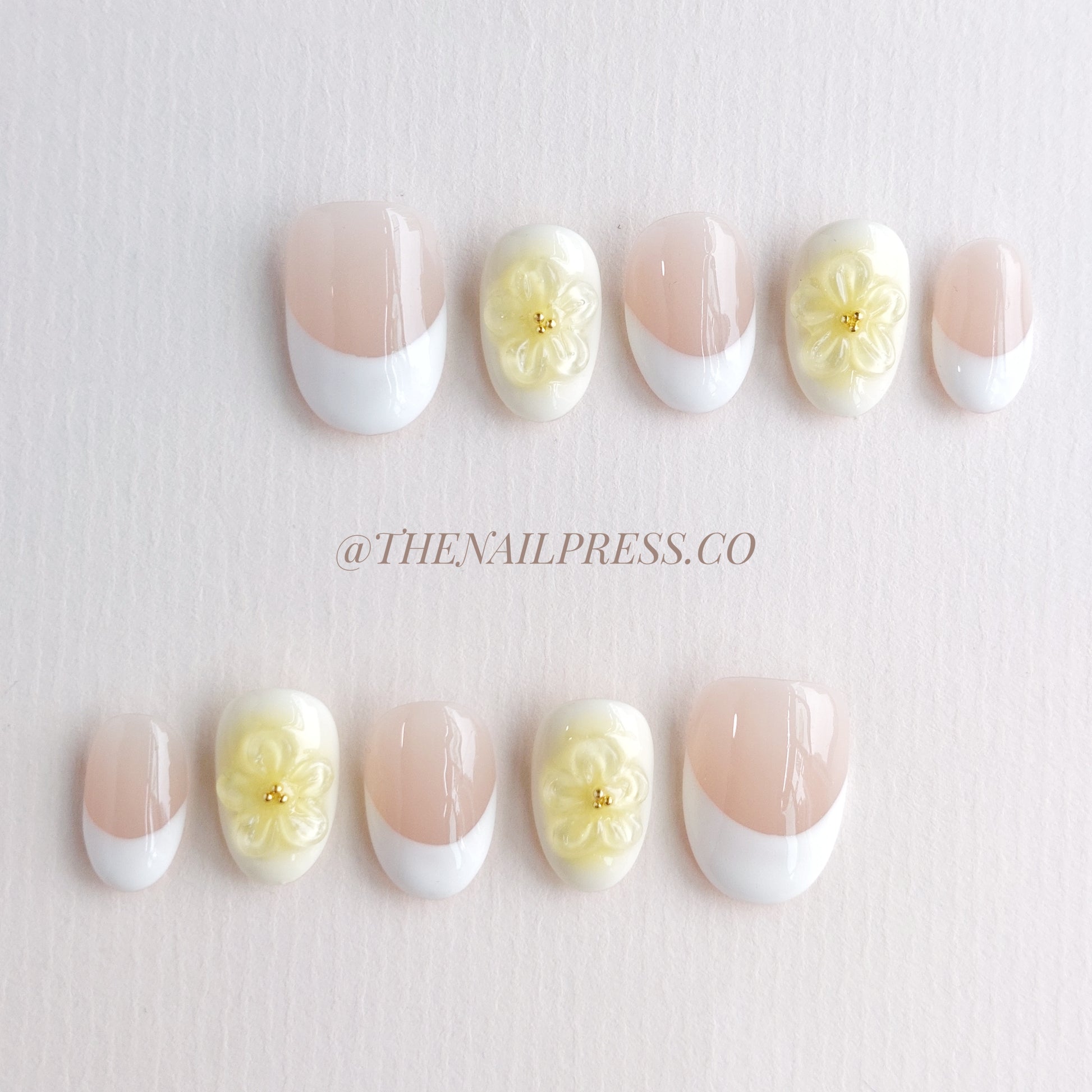 Embrace sunny vibes with Lemonade Sunshine Blossoms, featuring white French tips adorned with vibrant yellow sculpted flowers. The short rounded shape adds a classic finish. These handmade press-on nails are crafted for effortless wear, delivering a polished, salon-quality finish.