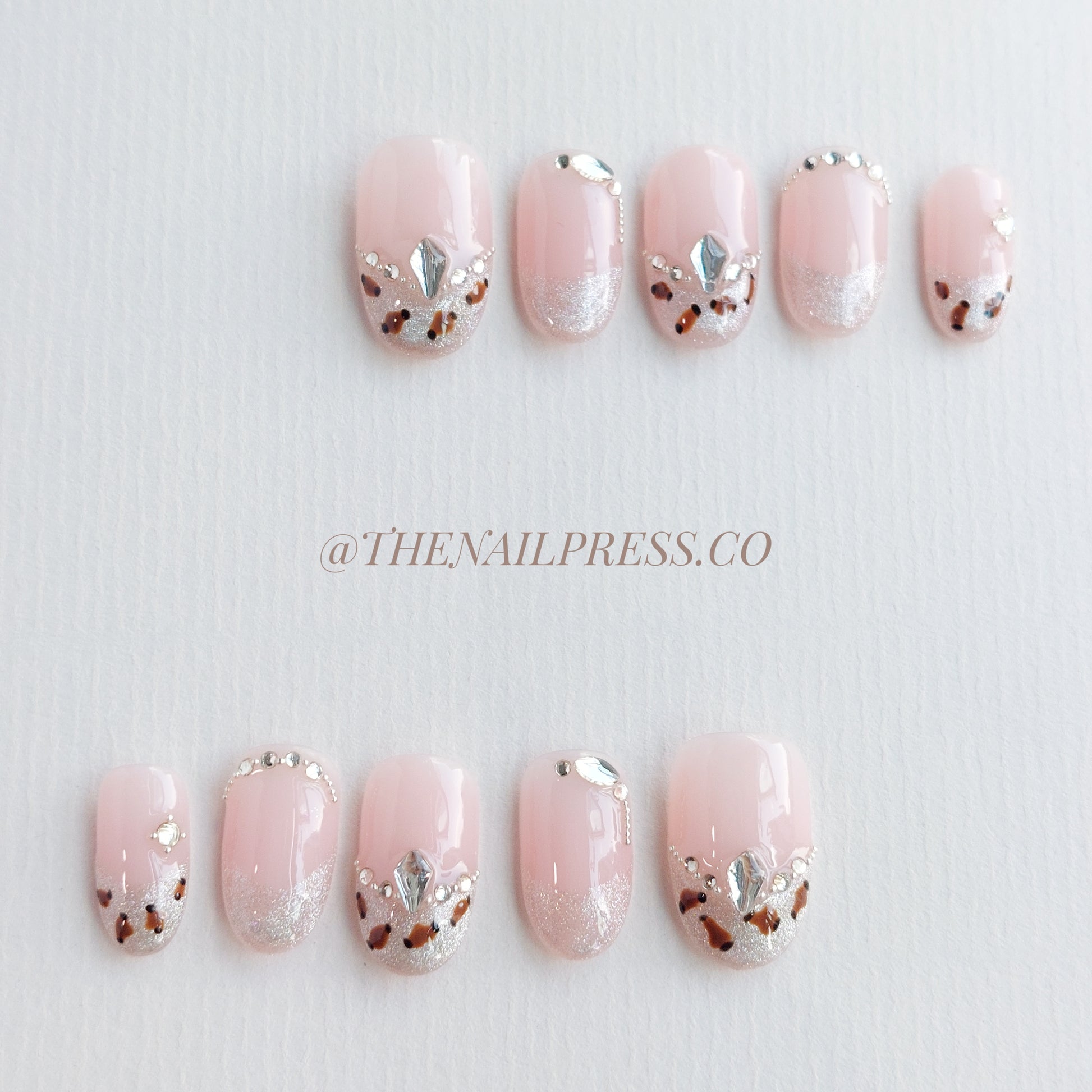 Make a bold statement with Leopard Glam, combining shimmering cat-eye French tips with fierce leopard print and sparkling gems. The rich contrast and dazzling details create a glamorous, high-impact look. The medium rounded shape enhances the sleek, flattering silhouette. Handcrafted and reusable, these nails offer a salon-quality finish that elevates your style with confidence.