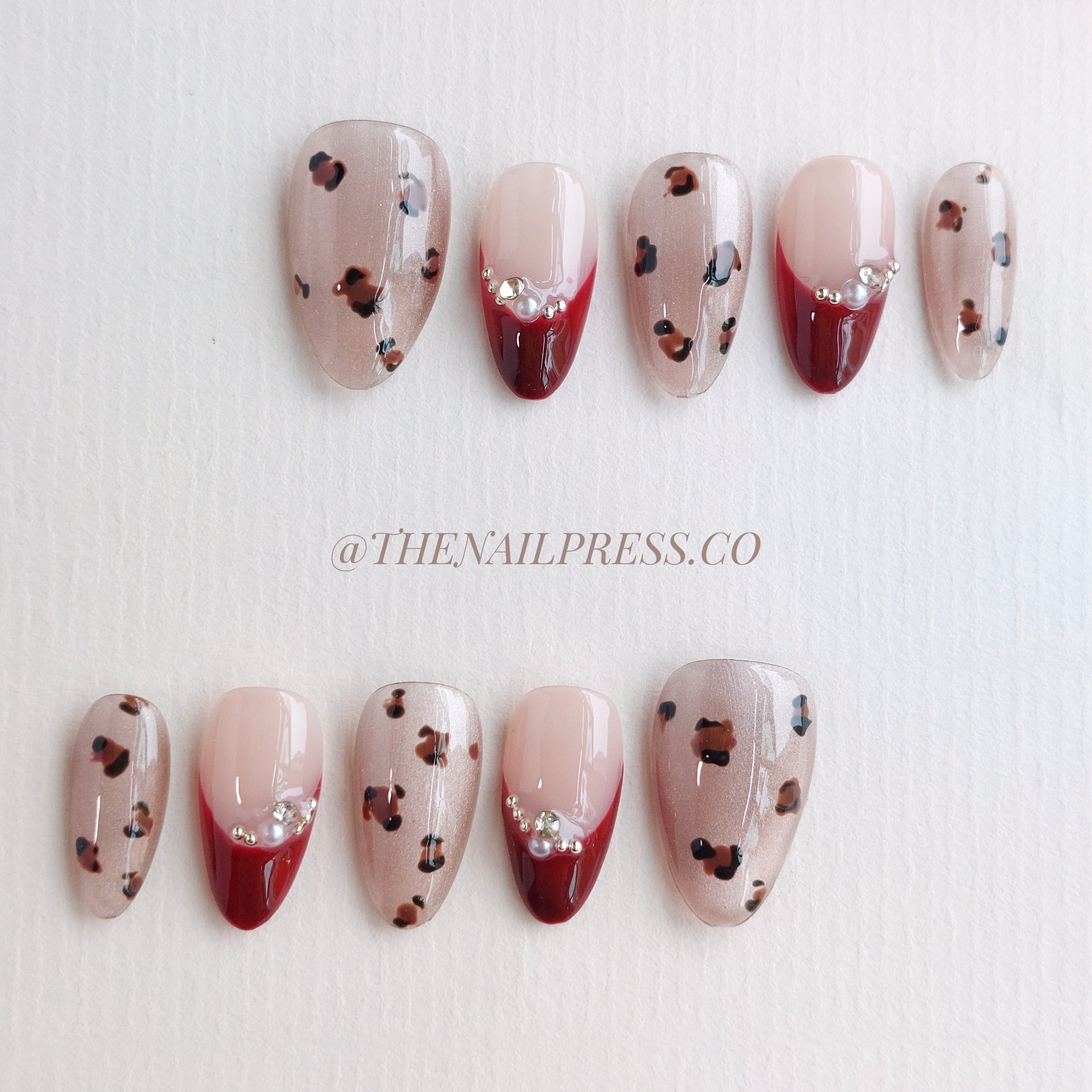 Command attention with Leopard Royale, blending fierce style with regal elegance. Rich red French tips complement bold leopard print, while dazzling gems add a luxurious sparkle. The short almond shape exudes confidence and sophistication, perfect for making a statement at glamorous evenings or adding a royal touch to your look. Handmade, reusable, and salon-quality for nails that look effortlessly beautiful and last all day.