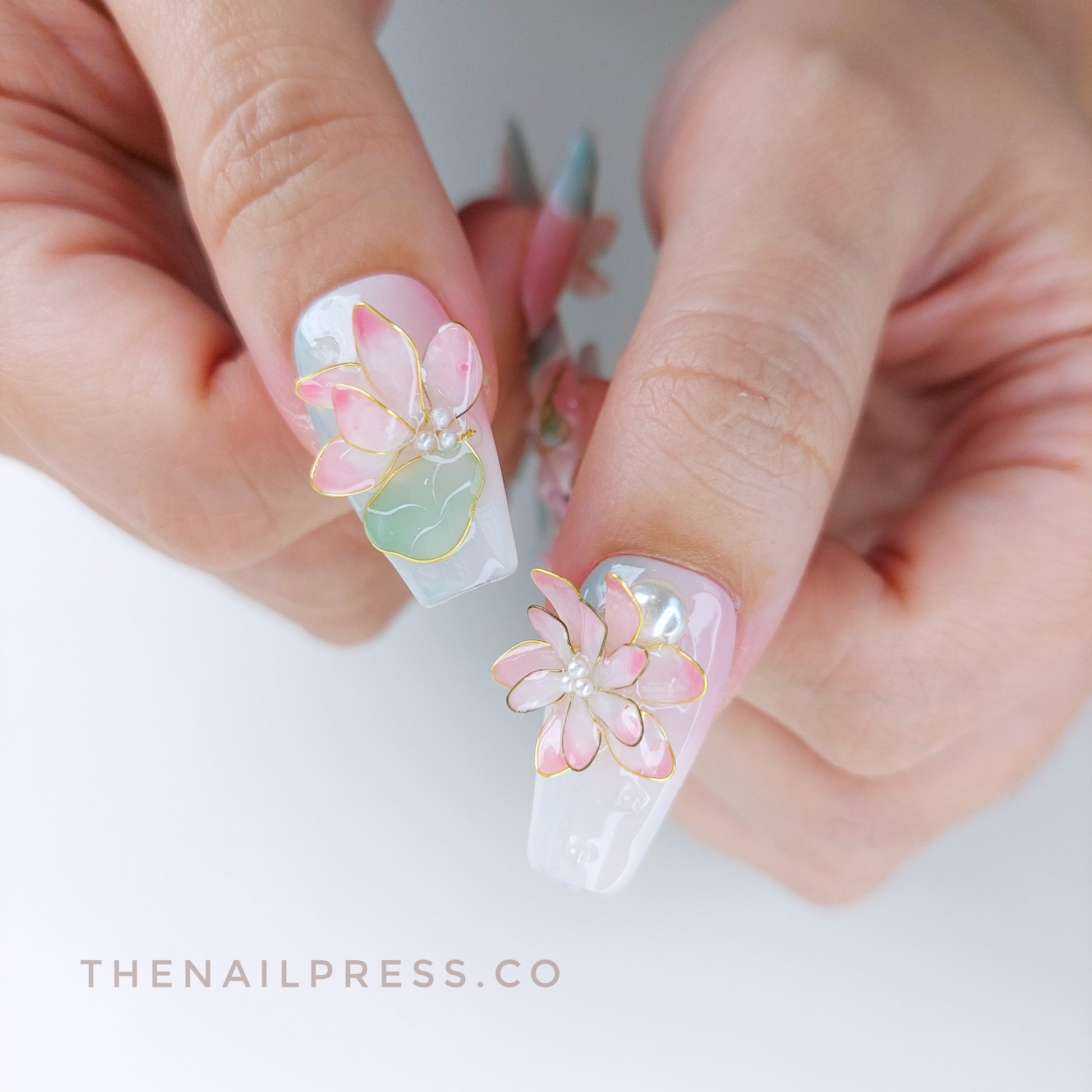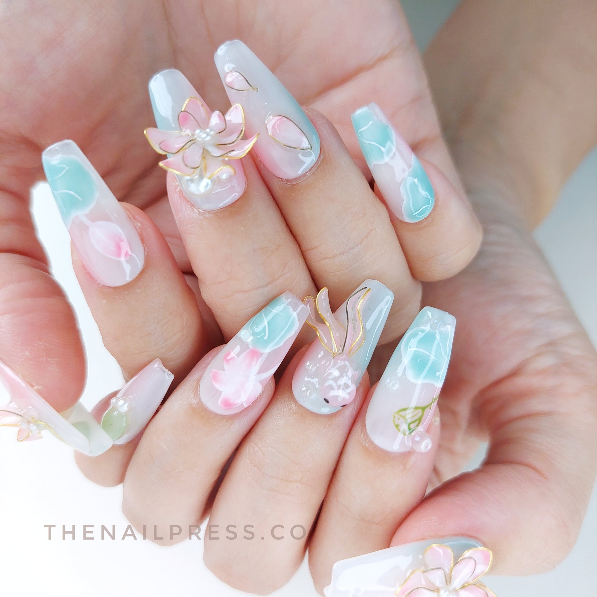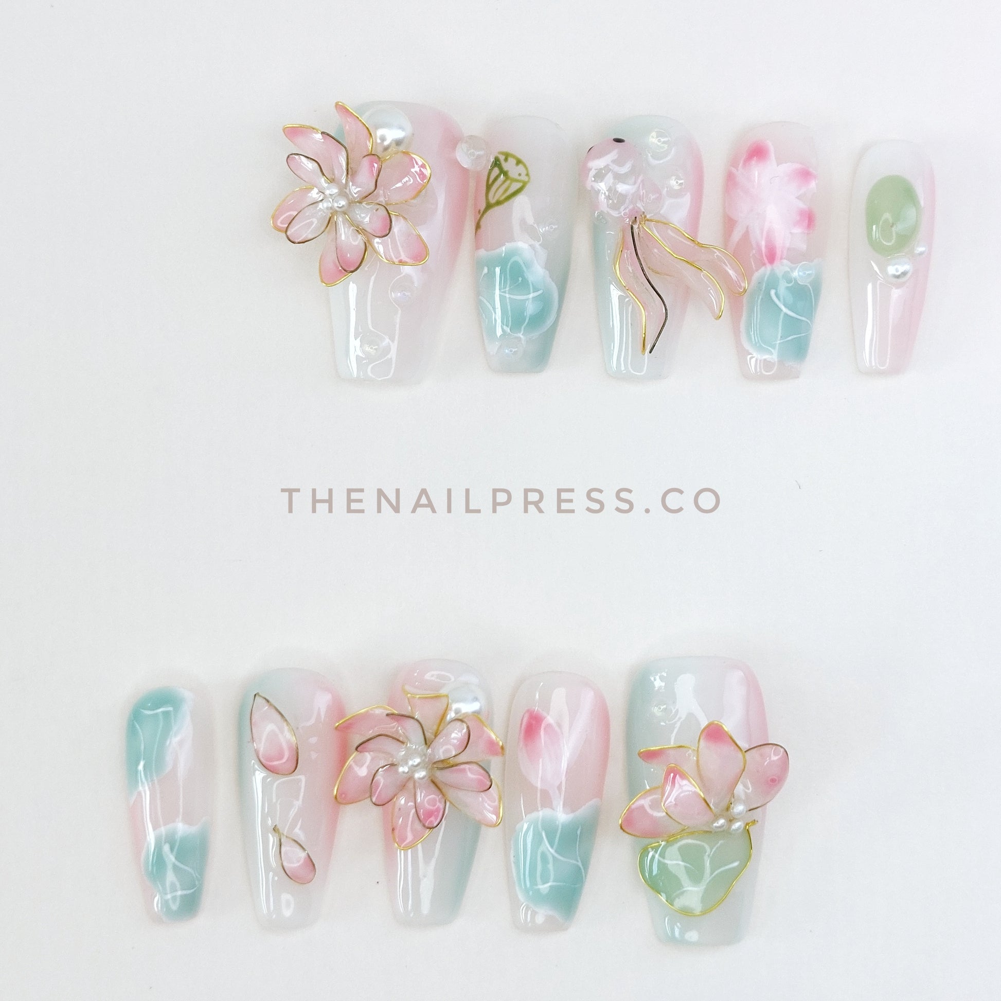 Delicate pink and green oriental-inspired artwork sets the scene for an elaborate 3D sculpted lotus flower and koi fish, creating a serene, storytelling design. The medium coffin shape adds a modern, elegant edge to the intricate details. These handmade press-on nails offer a salon-quality finish with effortless application.