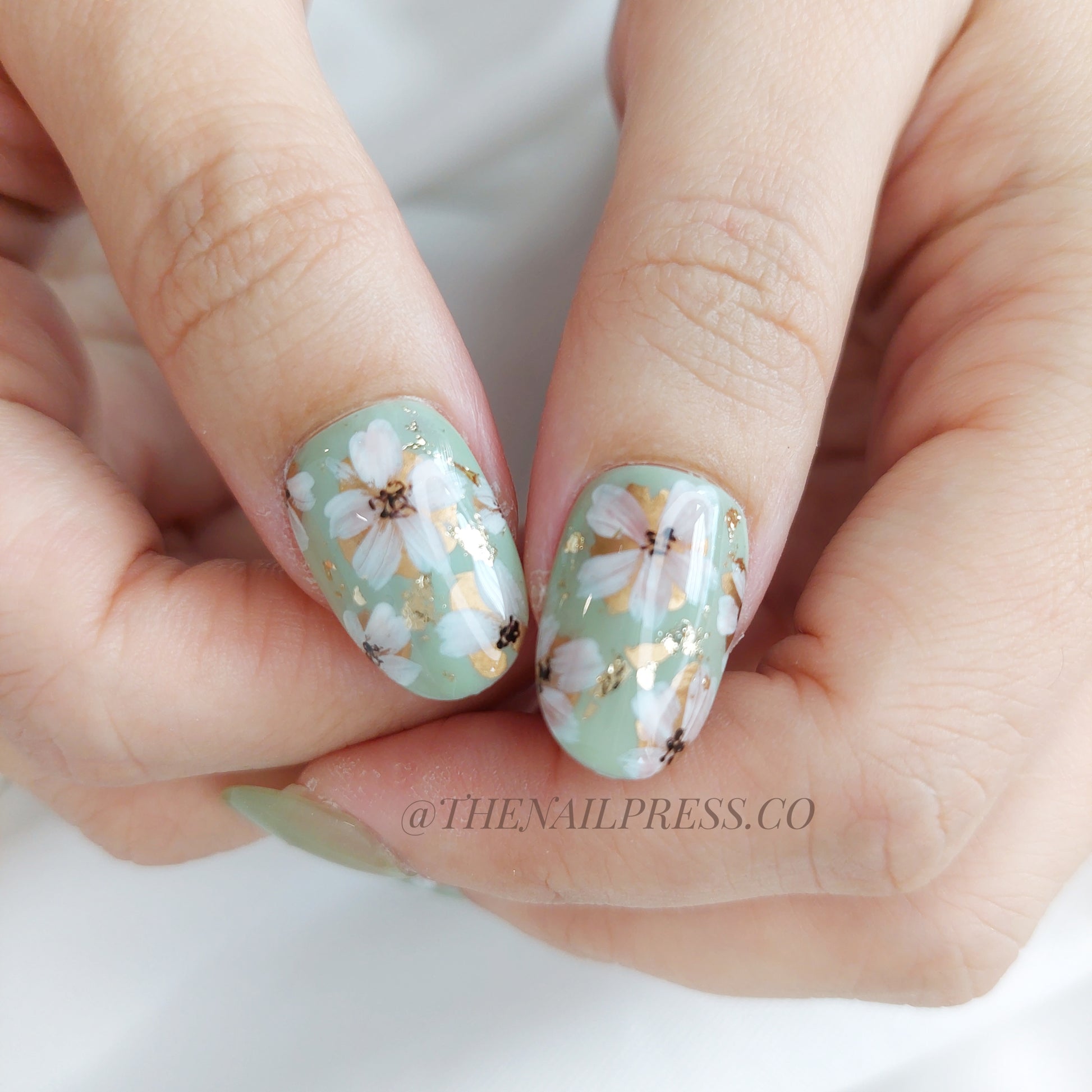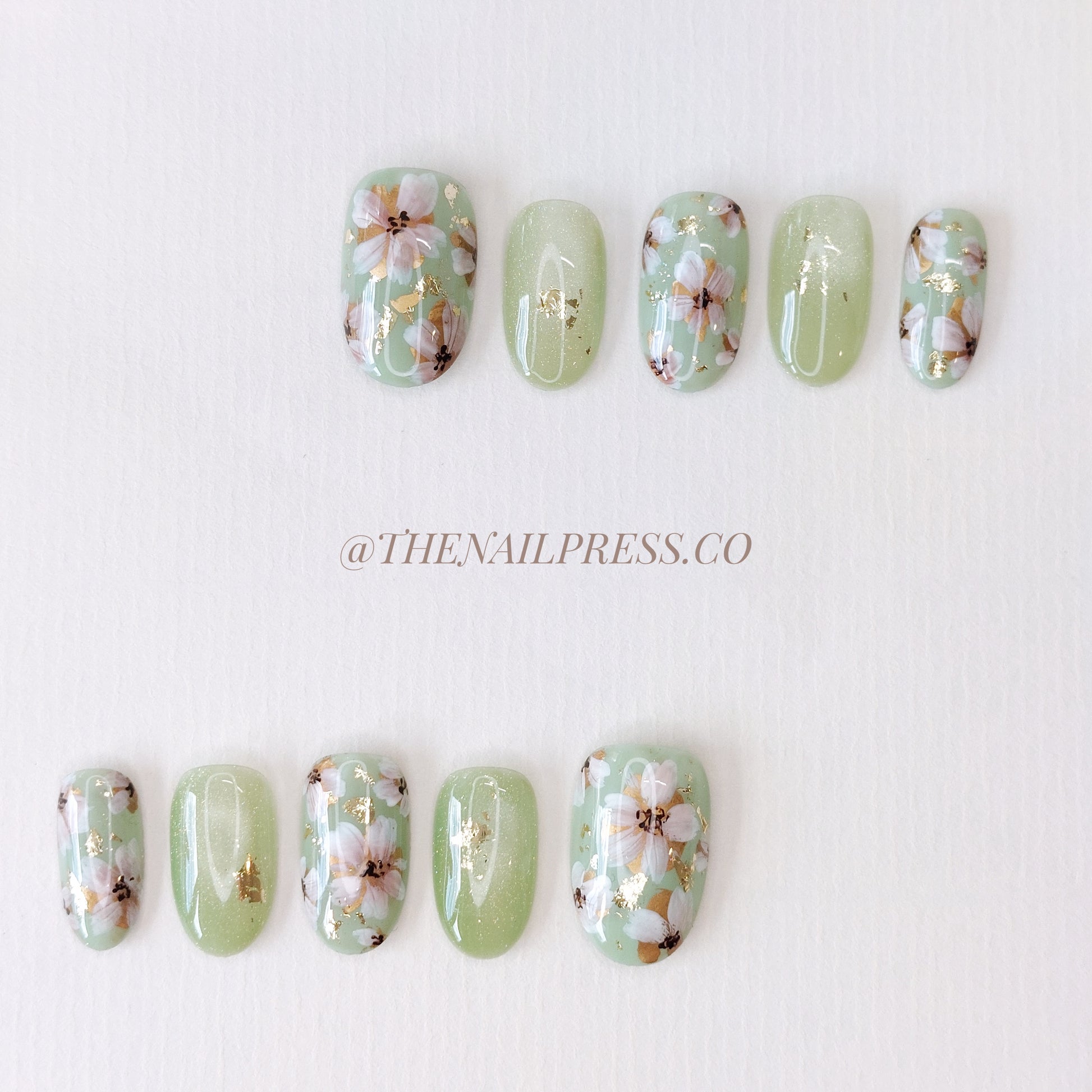 A vibrant apple green cat-eye base with elegant florals and shimmering gold foil accents creates a fresh, radiant look in Lush Petal Shine. The medium oval rounded shape adds a graceful, sophisticated touch. These handmade press-on nails are reusable and offer a salon-quality finish for effortless beauty.